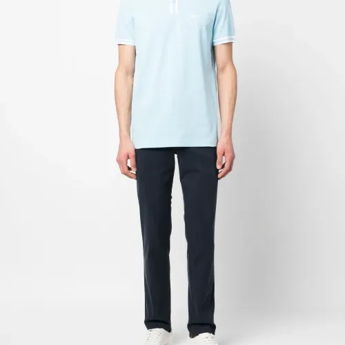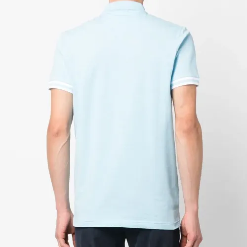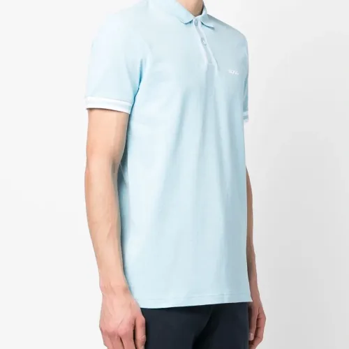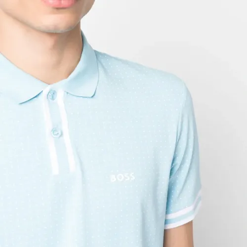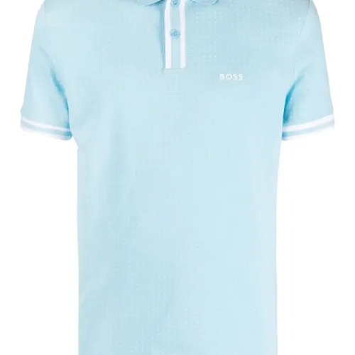 Нежно-голубой, эластичный хлопок, принт в мелкую точку, логотип спереди, полоски, прямой подол, воротник поло и короткие рукава.