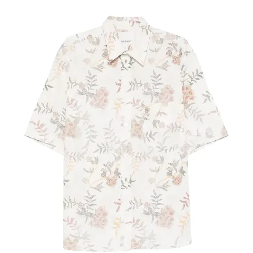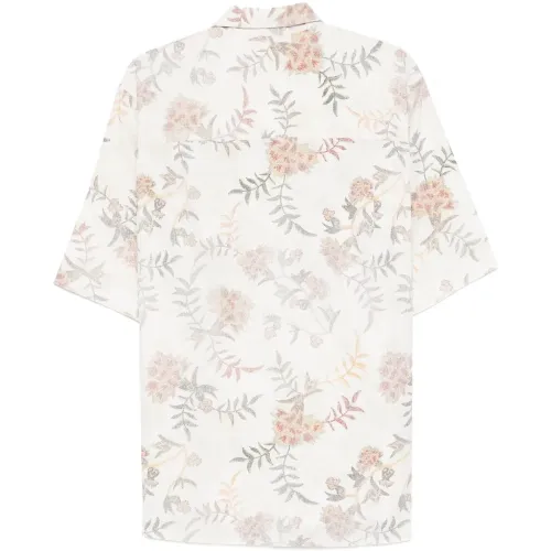 белая рубашка с цветочным узором, короткими рукавами, застёжкой на пуговицы и накладным карманом