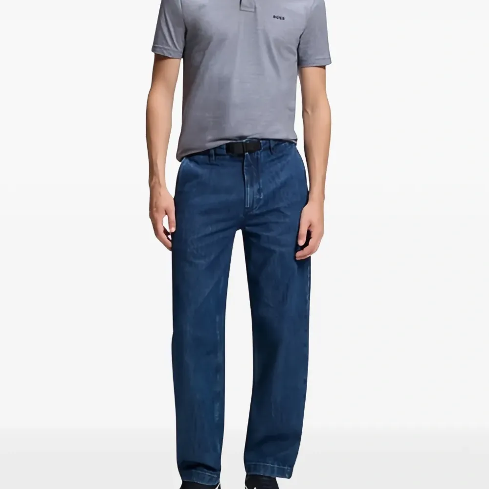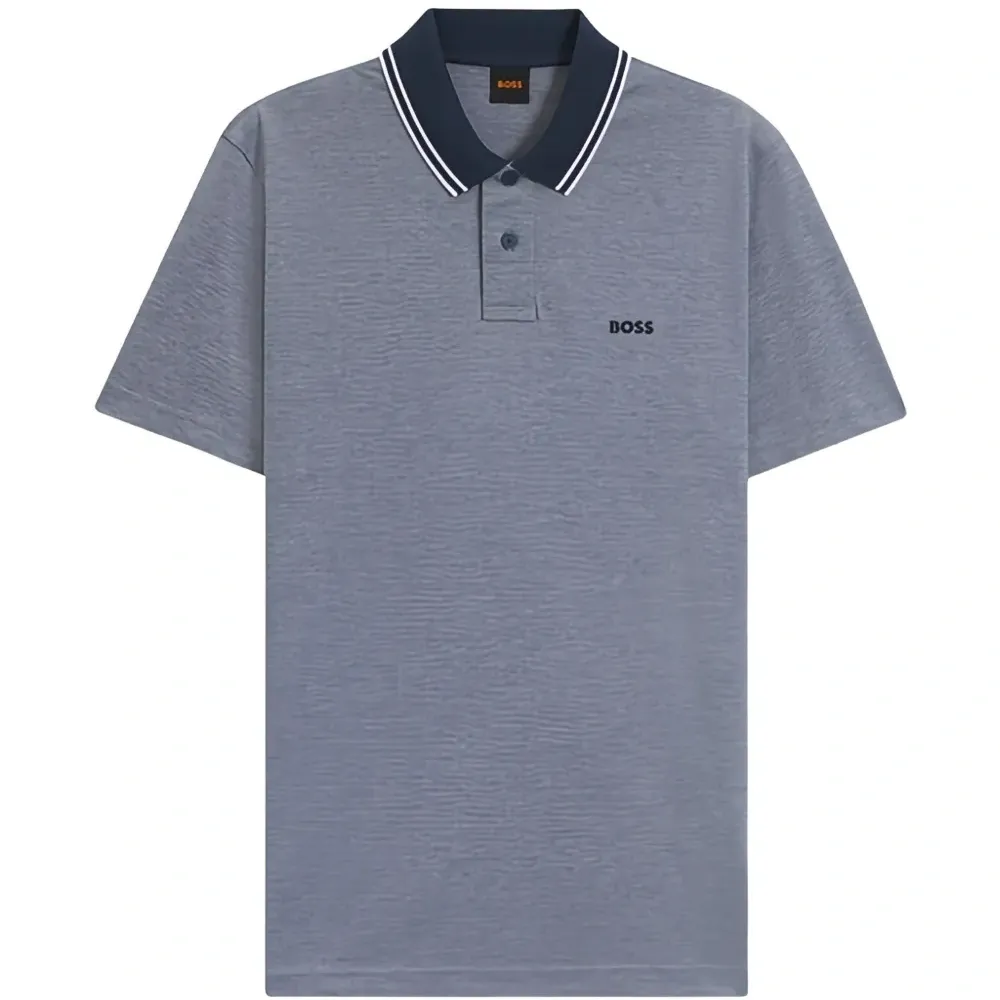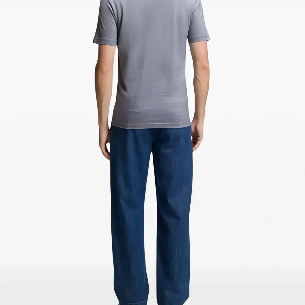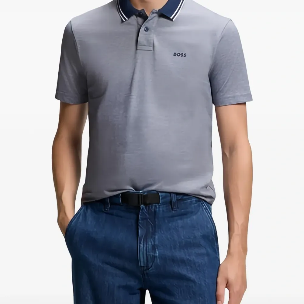 синяя рубашка с короткими рукавами, классическим воротником и принтом-логотипом
