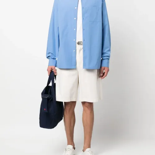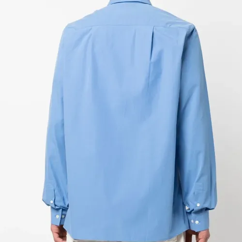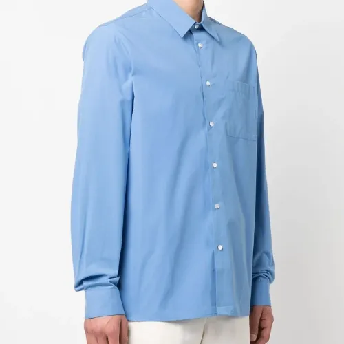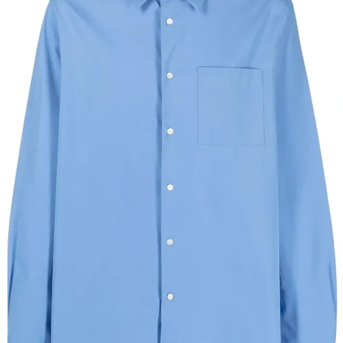 Кобальтово-синий, органический хлопок, классический воротник, застежка на пуговицах спереди, нагрудный накладной карман, длинные рукава, манжеты на пуговицах и прямой подол. Узнать больше о том, какие товары получают отметку «Ответственный выбор», можно из материала «Как мы оцениваем экологичность и этичность».
