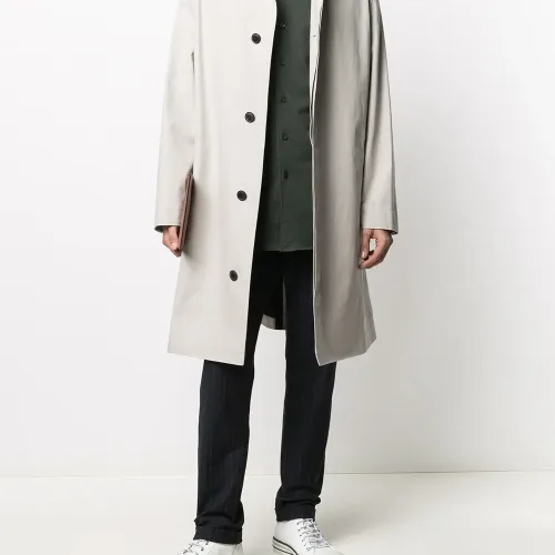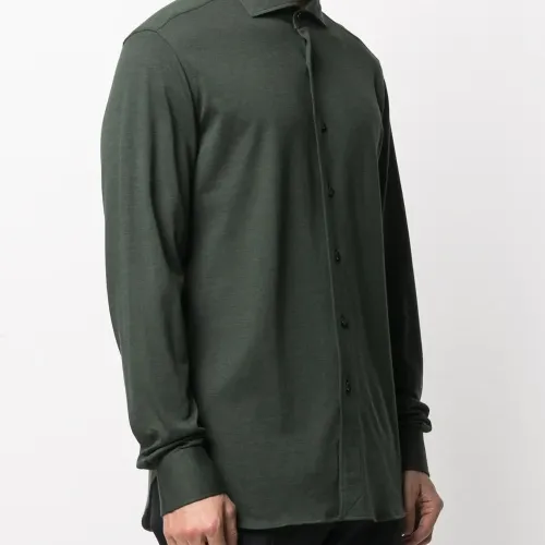 Косой воротник, застежка на пуговицах спереди, длинные рукава, манжеты на пуговицах и закругленный подол. Цвет: зеленый.