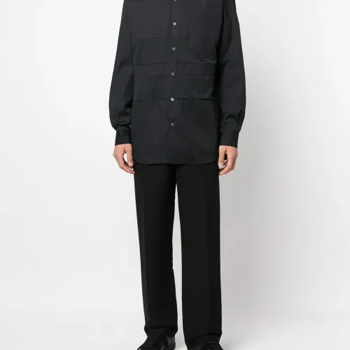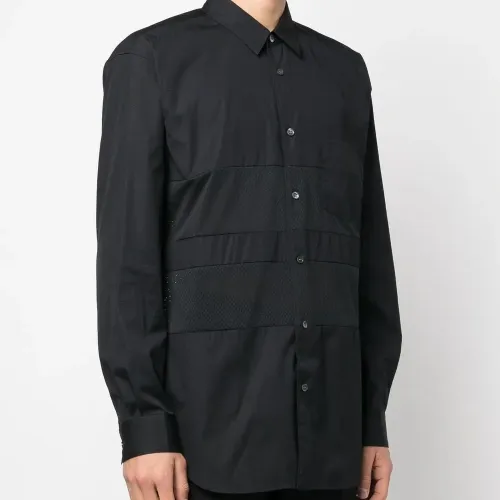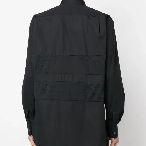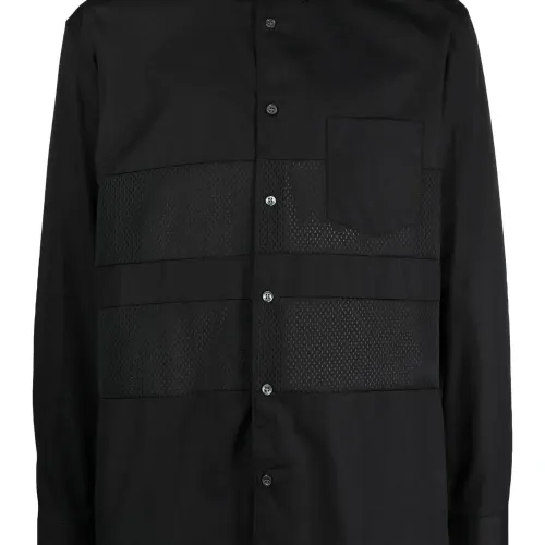 Черный, хлопок, вставки, сетчатые вставки, классический воротник, застежка на пуговицах спереди, нагрудный накладной карман, длинные рукава, манжеты на пуговицах и закругленный подол.