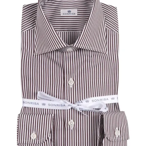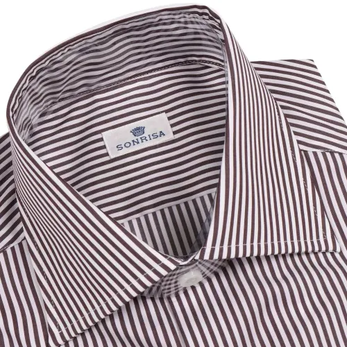 коричневая и белая полосатая рубашка с застёжкой на пуговицы, нагрудным карманом и длинными рукавами