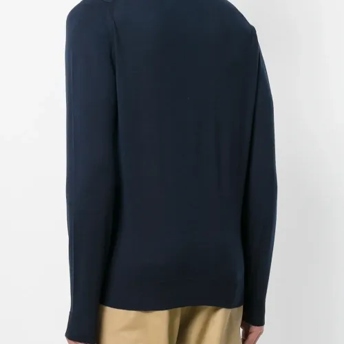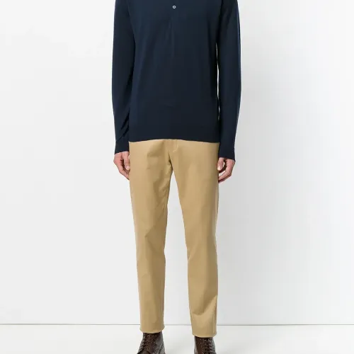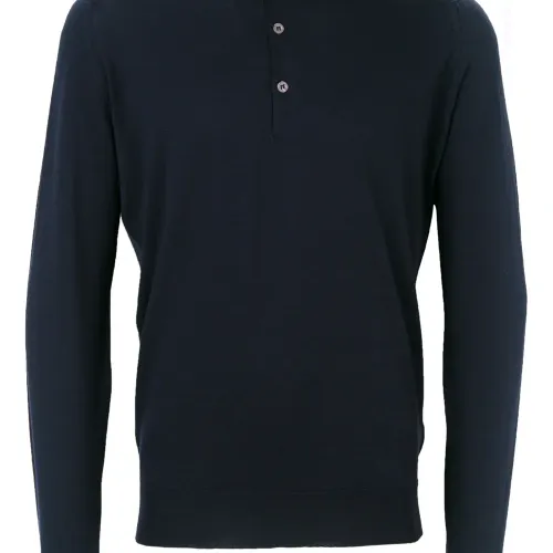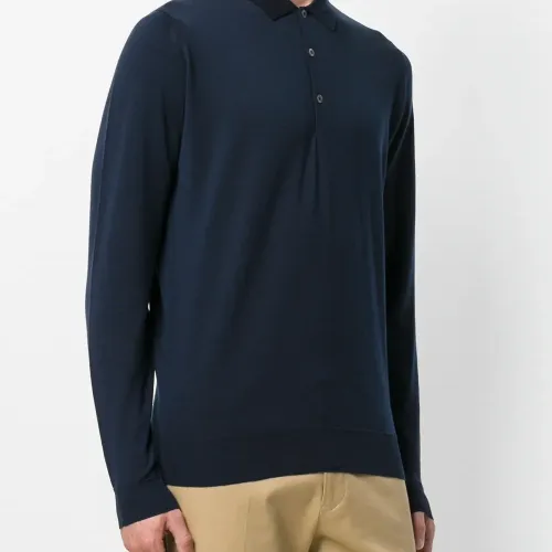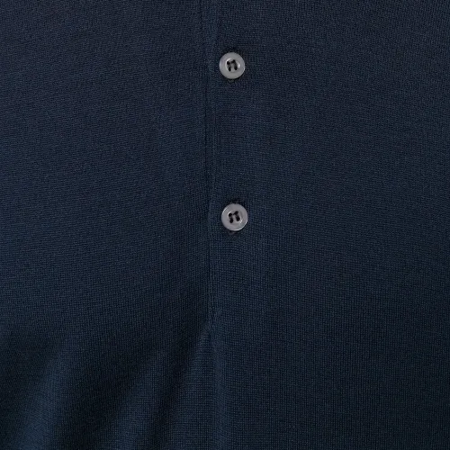 Синее трикотажное поло 'Belper' из мериносовой шерсти от John Smedley. Классический воротник-поло, планка на пуговицах спереди, длинные рукава.
