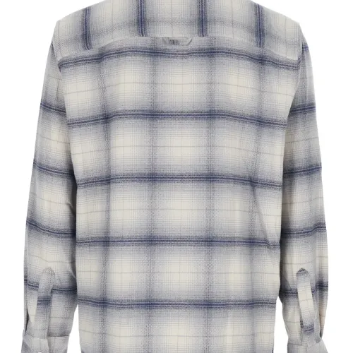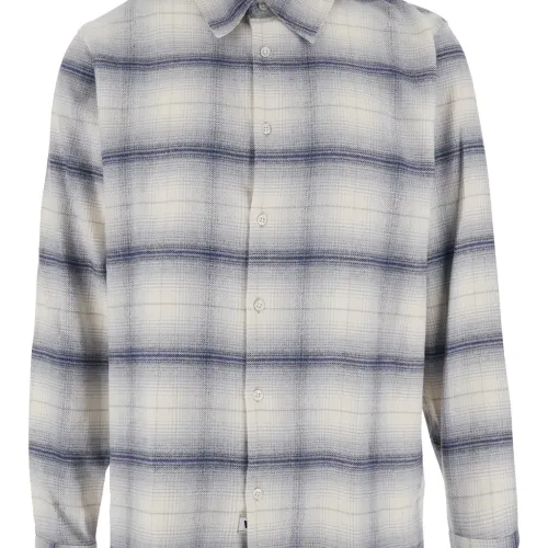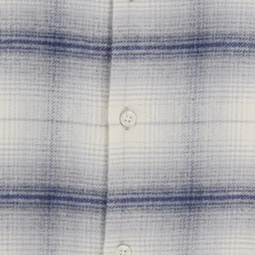 серо-синяя рубашка в клетку с классическим воротником, длинными рукавами, застежкой на пуговицы спереди и манжетами на пуговицах