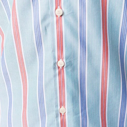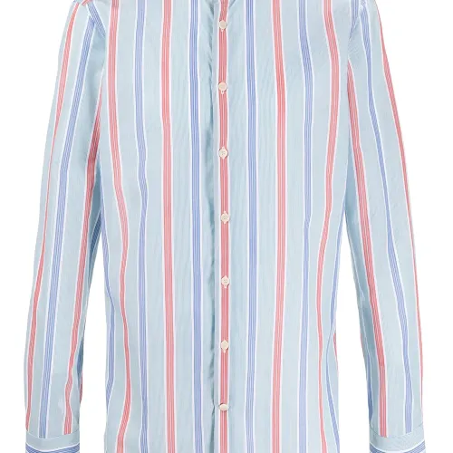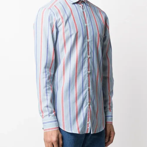 Полосатая рубашка с косым воротником от Etro (Этро). Свободный крой, застежка на пуговицах спереди, длинные рукава, манжеты на пуговицах и закругленный подол. Цвет: разноцветный.
