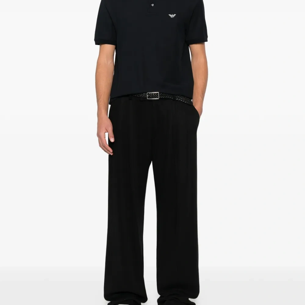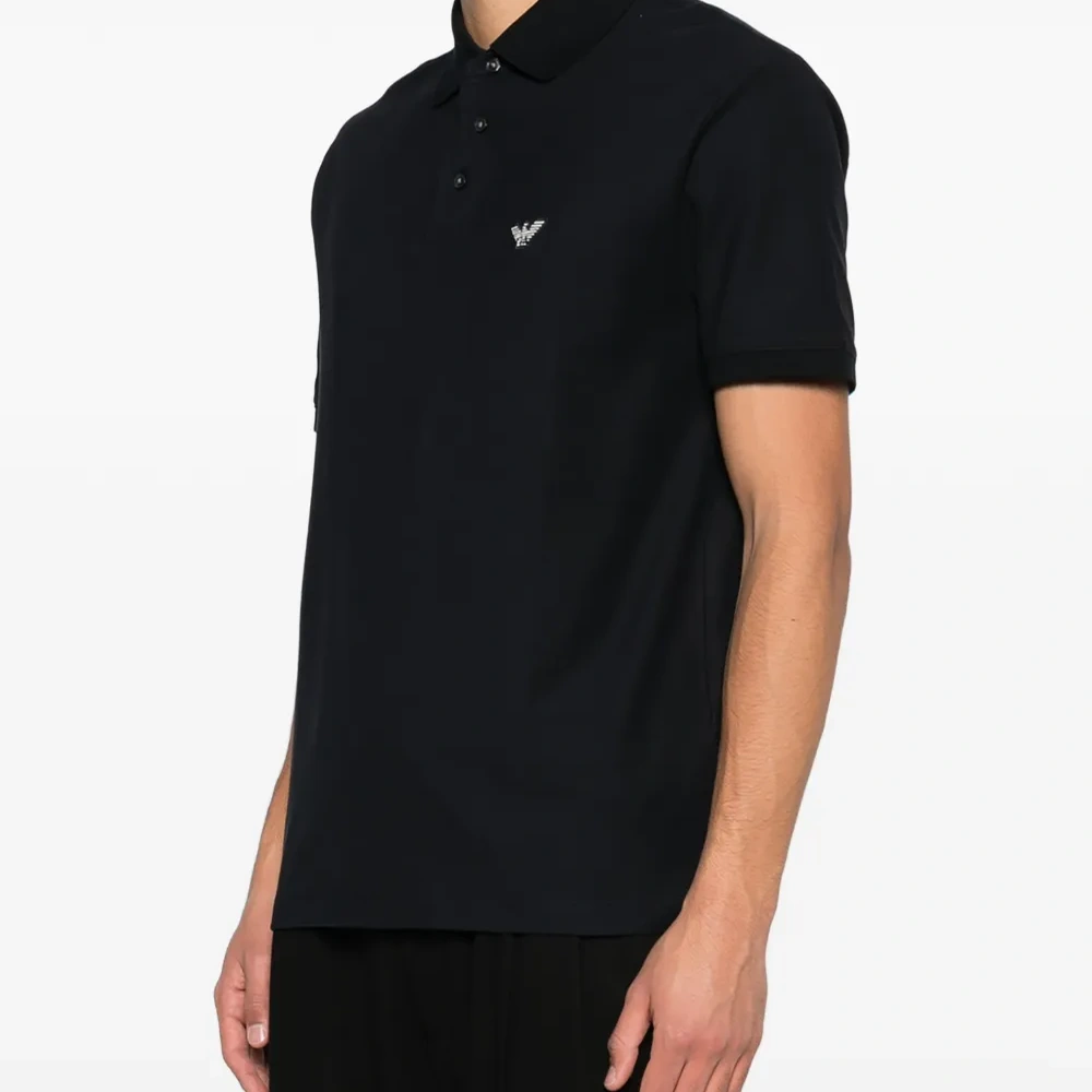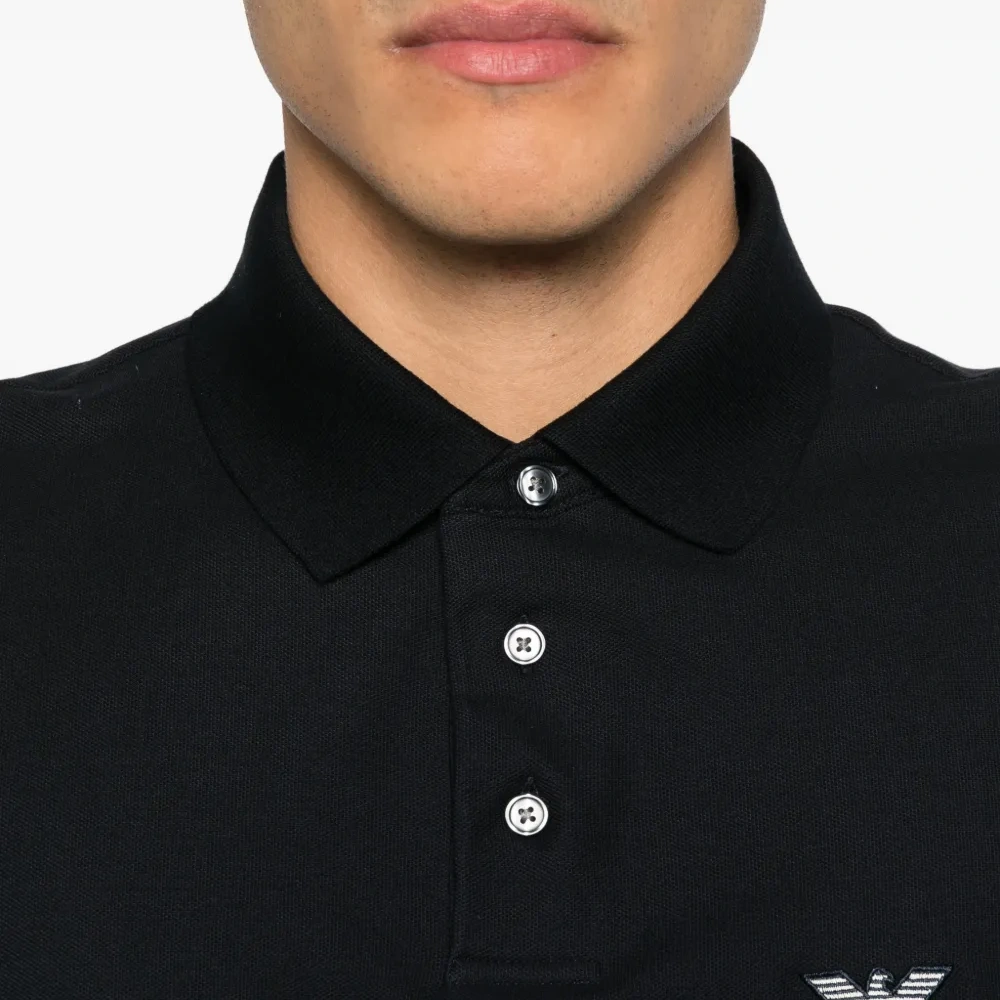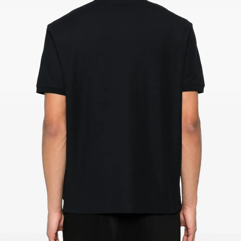 черное поло с вышитым логотипом, воротником и короткими рукавами, на пуговицах