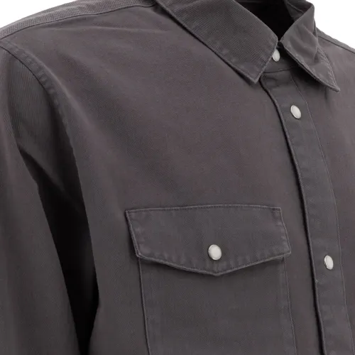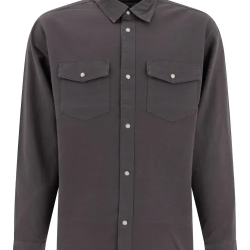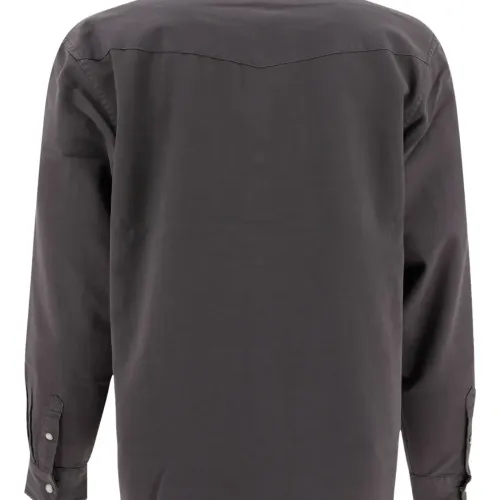 серый цвет, два нагрудных кармана, воротник с острыми концами, длинные рукава, манжеты на пуговицах