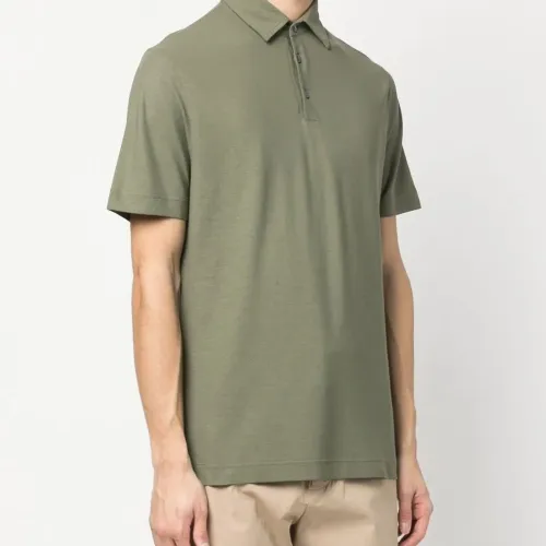 Серо-зеленый, хлопок, воротник поло, планка на пуговицах спереди и короткие рукава.