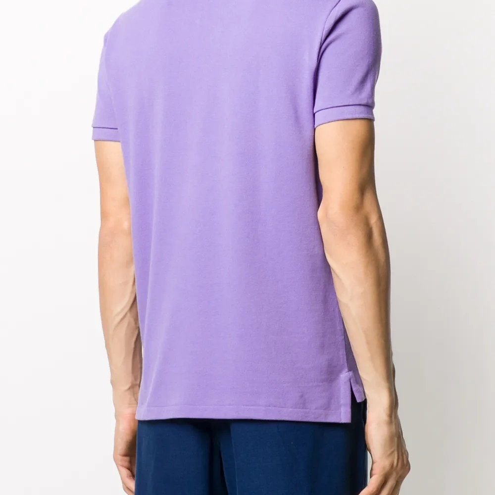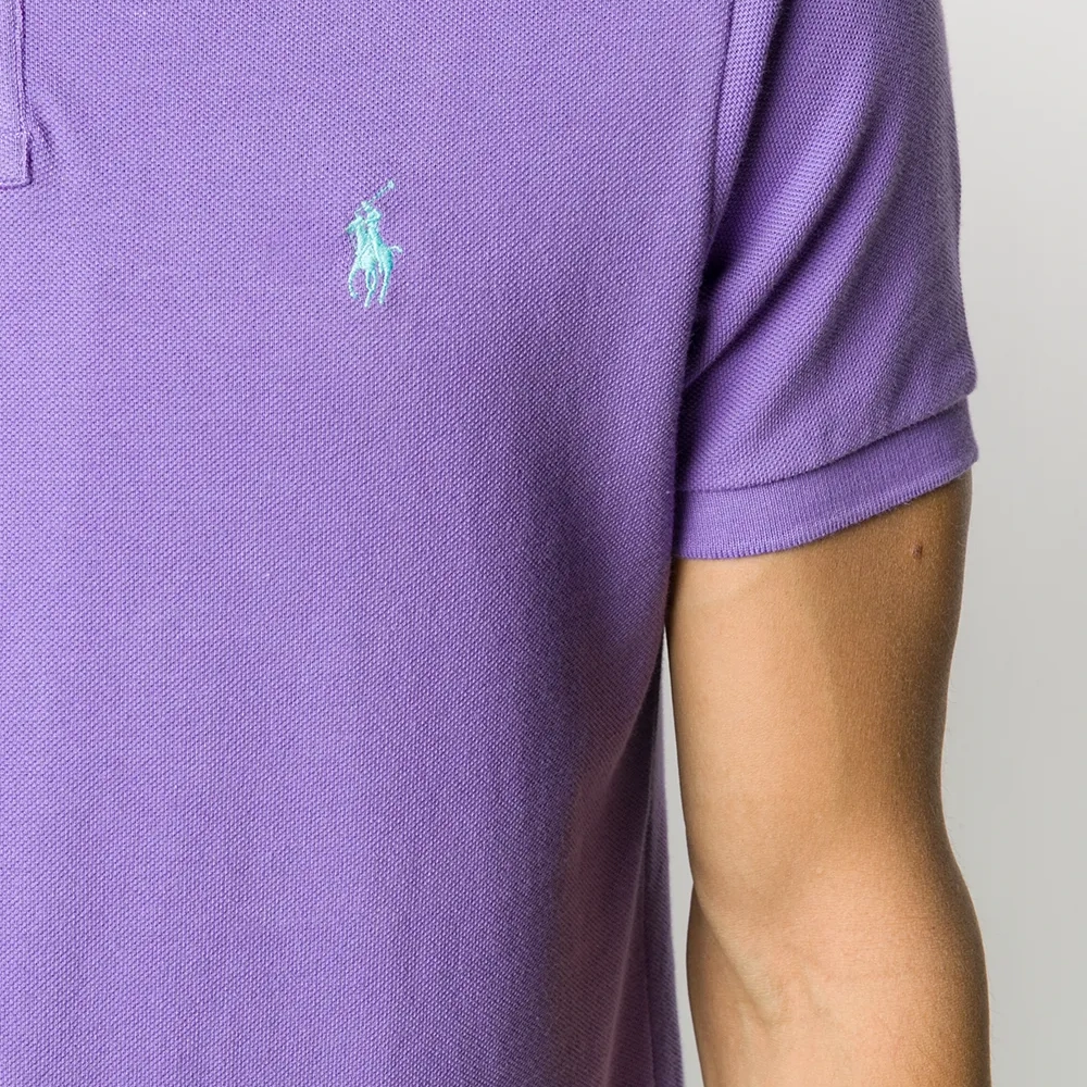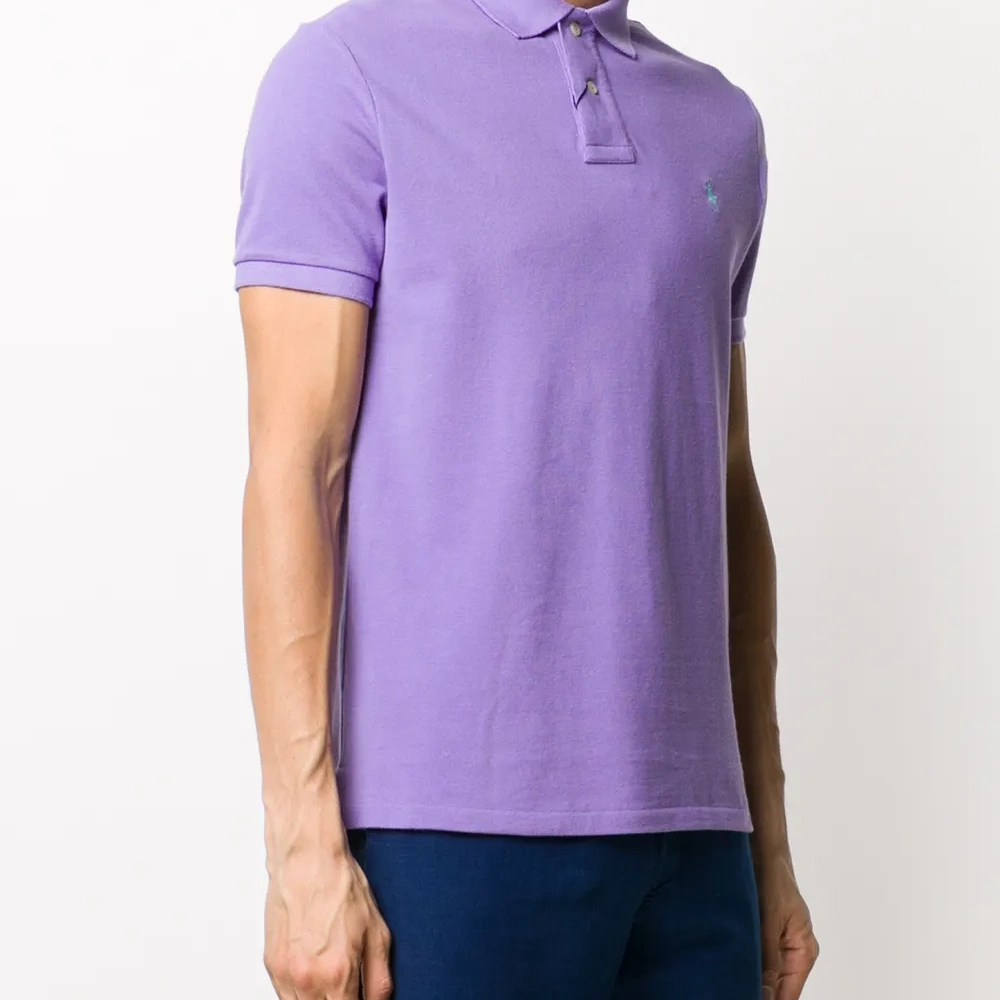 Воротник поло, планка на пуговицах спереди, вышитый логотип на груди и короткие рукава.