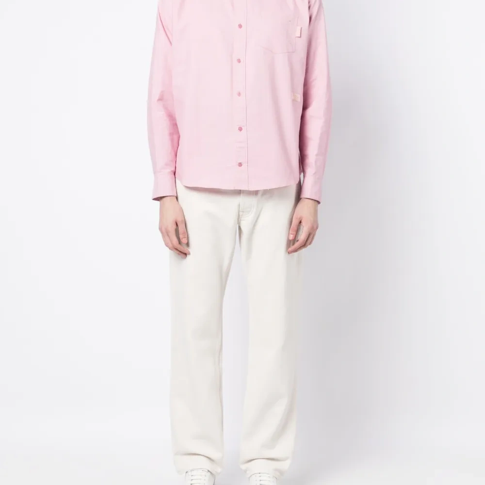 Морганит, хлопок, классический воротник, застежка на пуговицах спереди, длинные рукава, нагрудный накладной карман и закругленный подол.