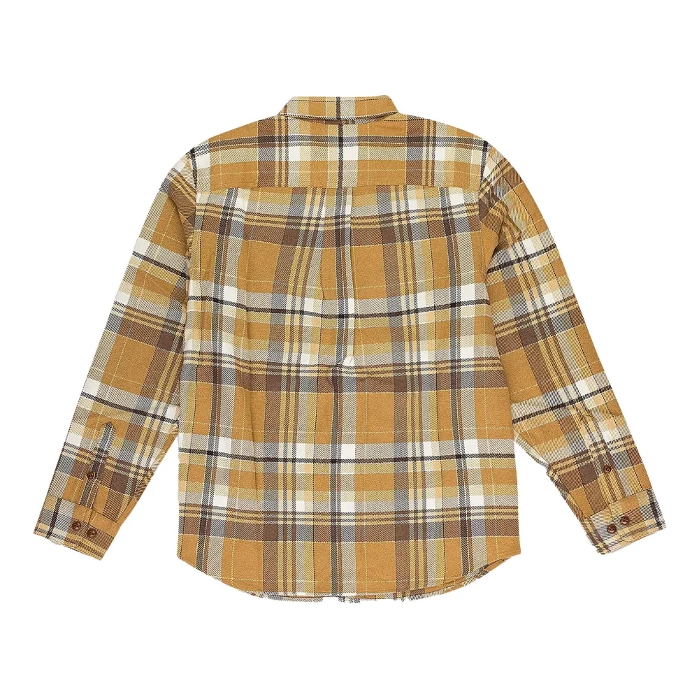 коричневая рубашка в клетку, застежка на пуговицы, длинные рукава, нагрудные накладные карманы, манжеты на пуговицах