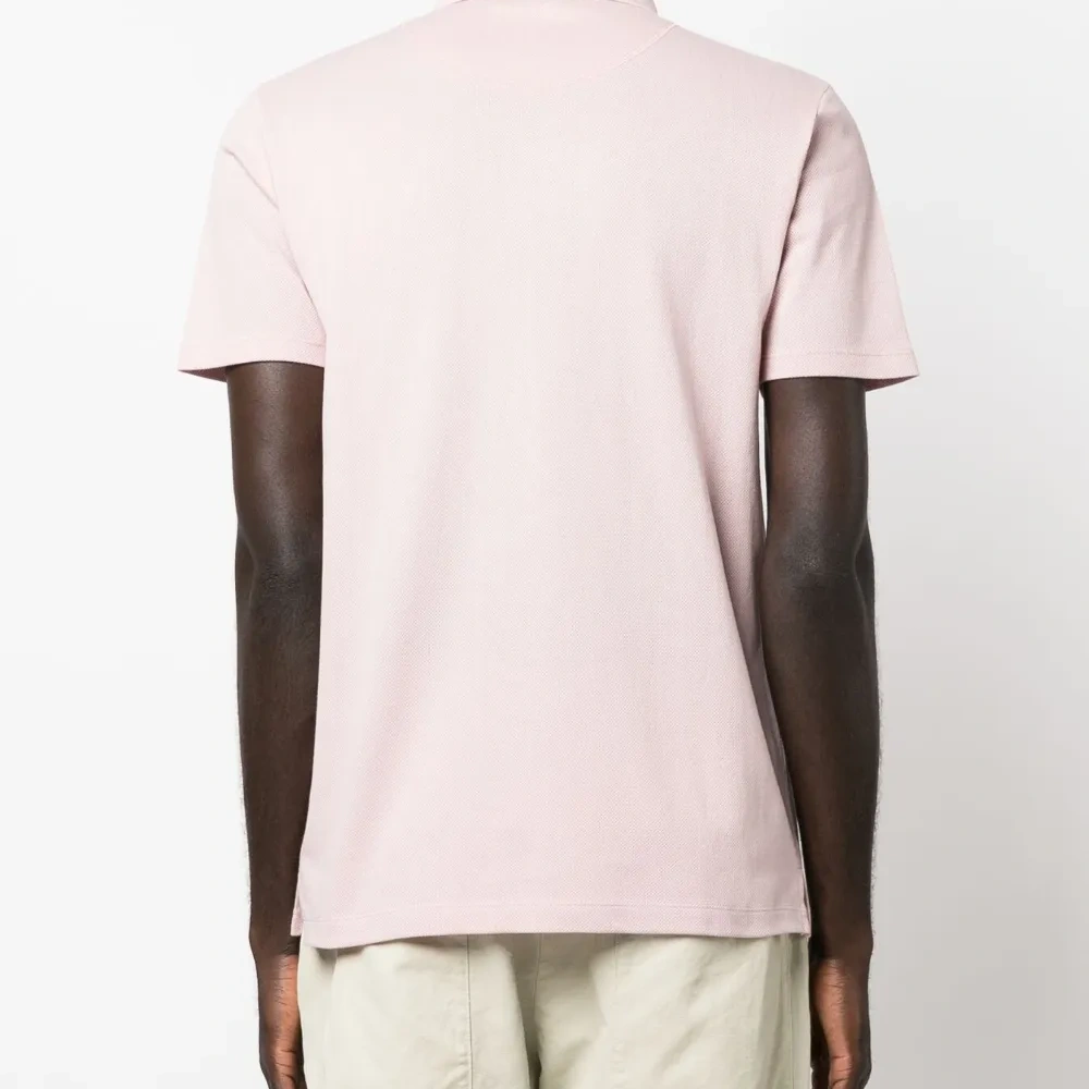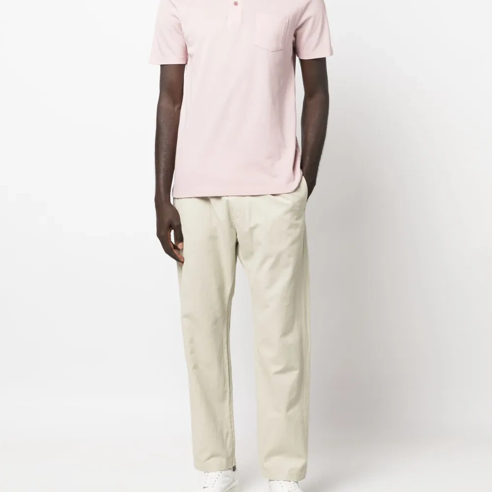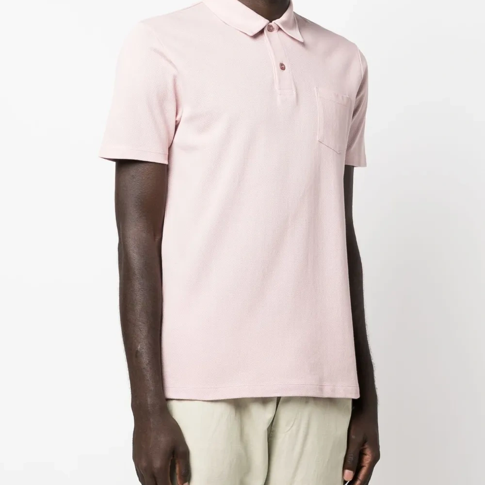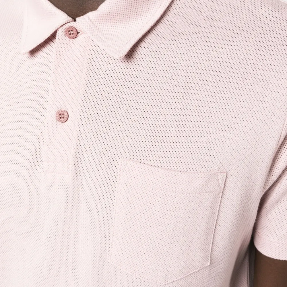 Светло-розовый, хлопок, ткань пике, воротник поло, планка на пуговицах спереди, нагрудный накладной карман, короткие рукава и прямой подол.