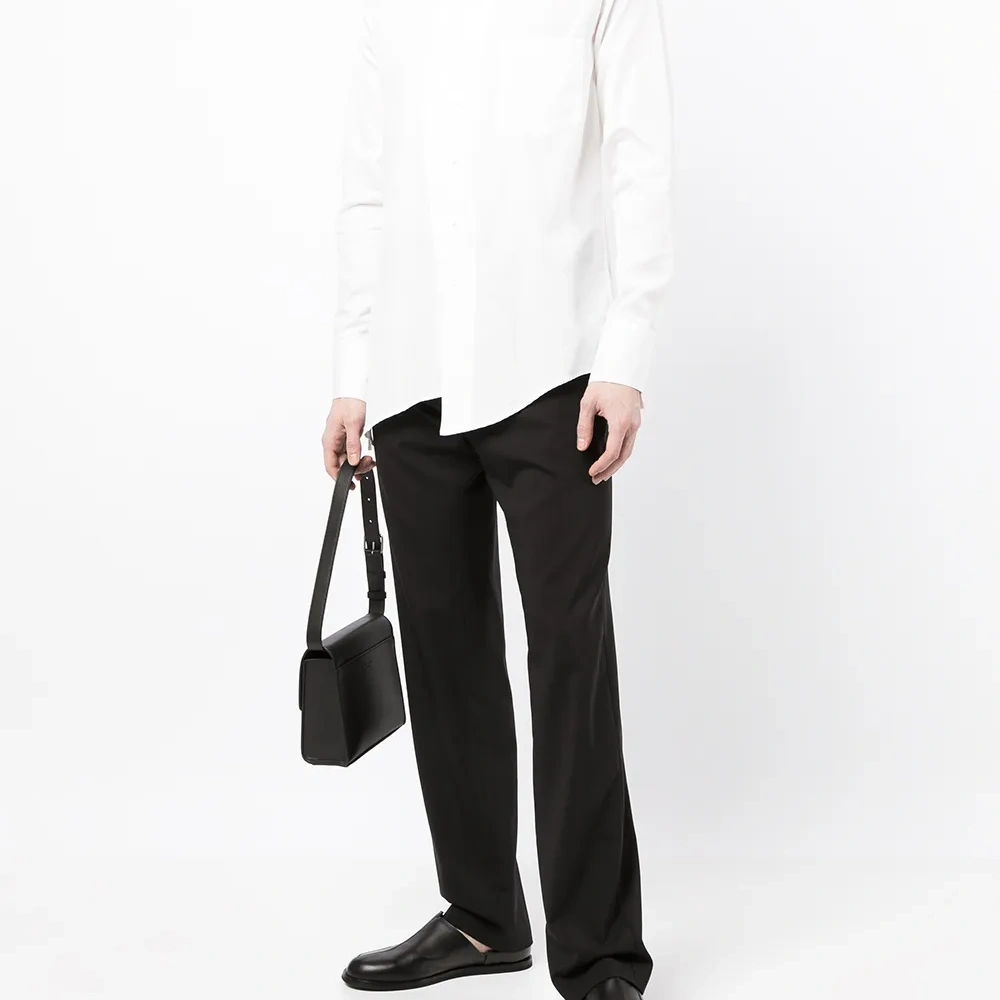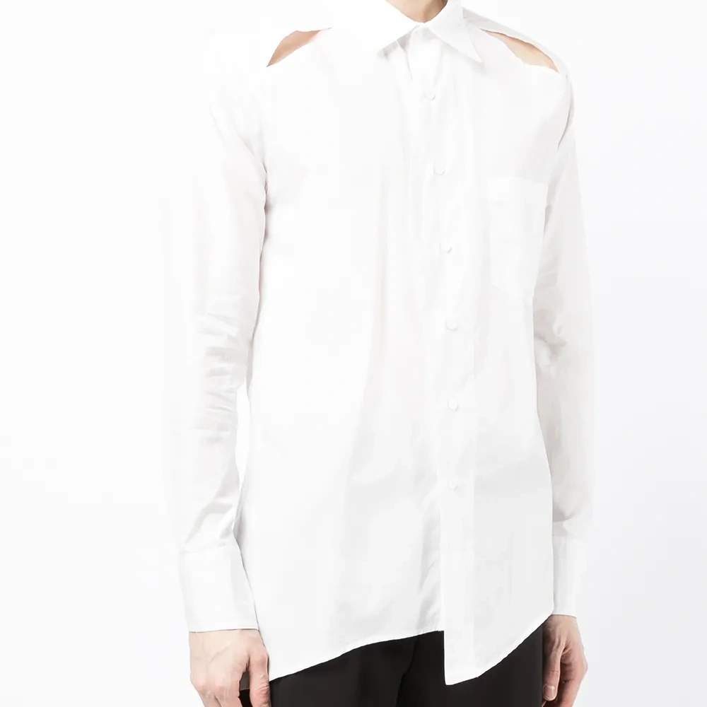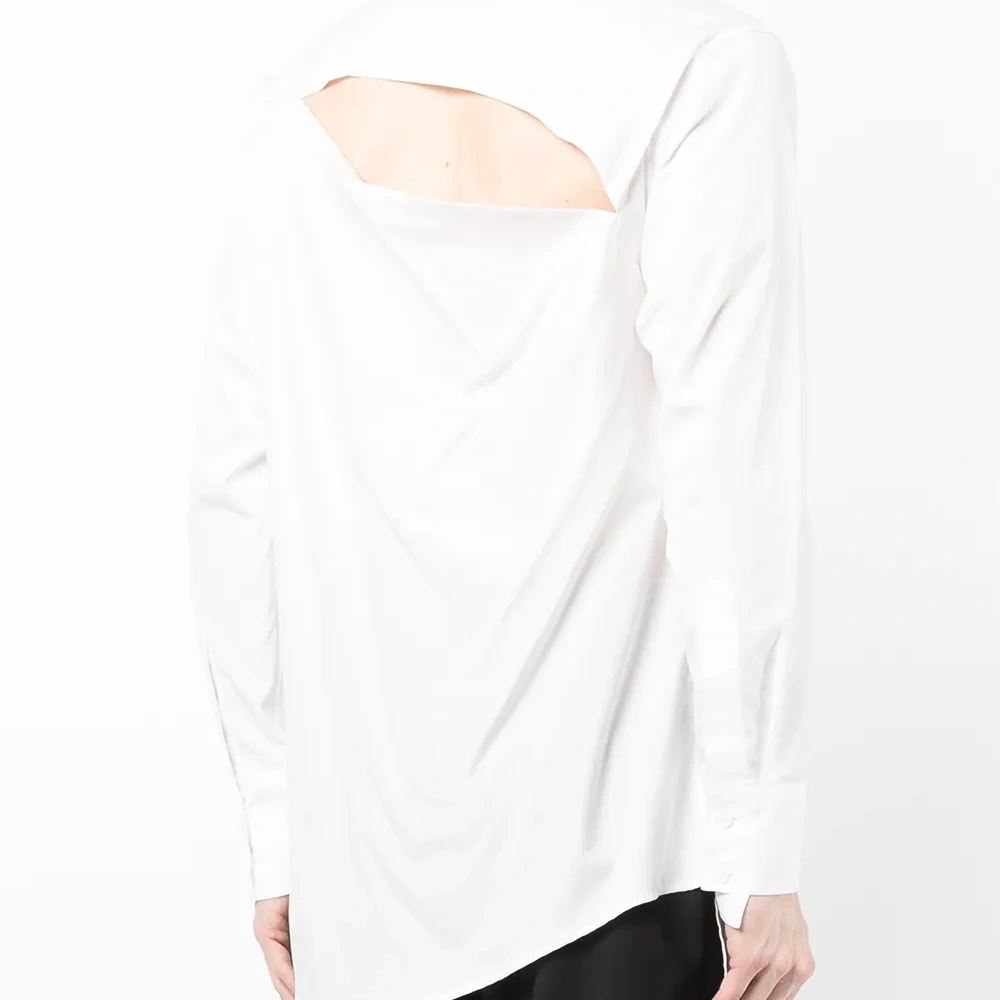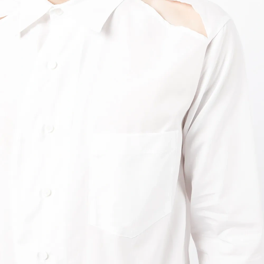 Вырезные детали, классический воротник, застежка на пуговицах спереди и длинные рукава.