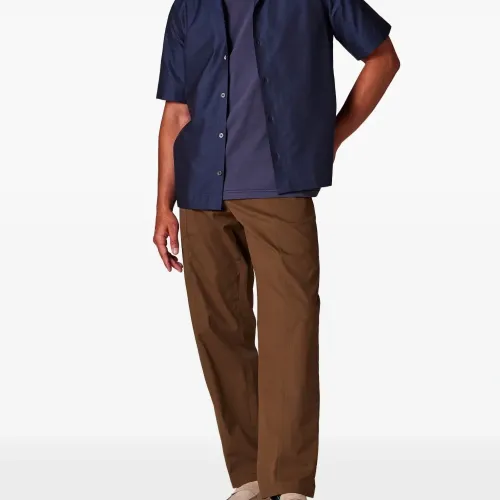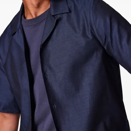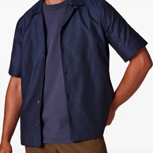 тёмно-синяя рубашка с короткими рукавами, застёжкой на пуговицы, отложным воротником, прямым подолом и боковыми разрезами