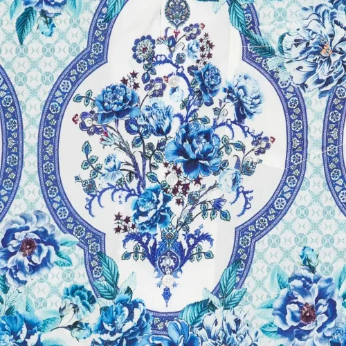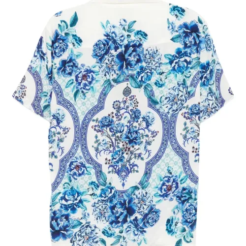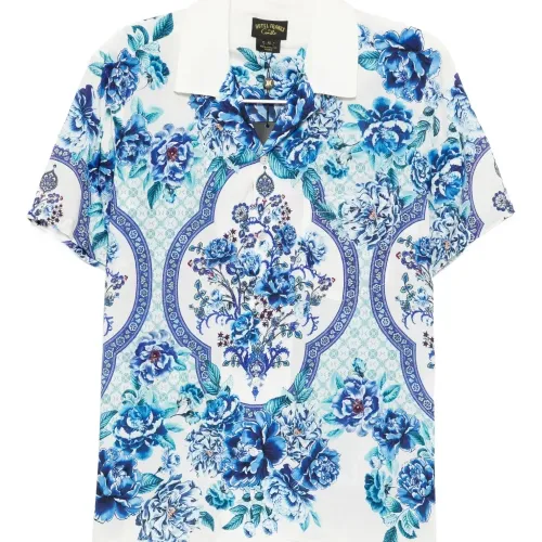 белая рубашка с цветочным принтом, короткими рукавами, отложным воротником и застёжкой на пуговицы