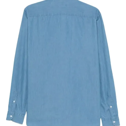 светло-голубая рубашка с вышитым логотипом, планкой на пуговицах и французским воротником