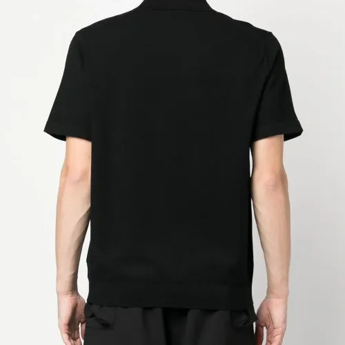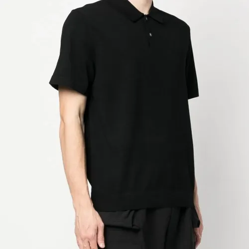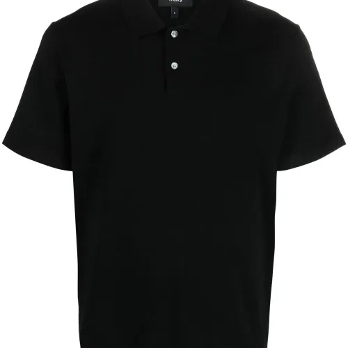 Черный, воротник поло, короткие рукава, подол в рубчик и прямой подол.