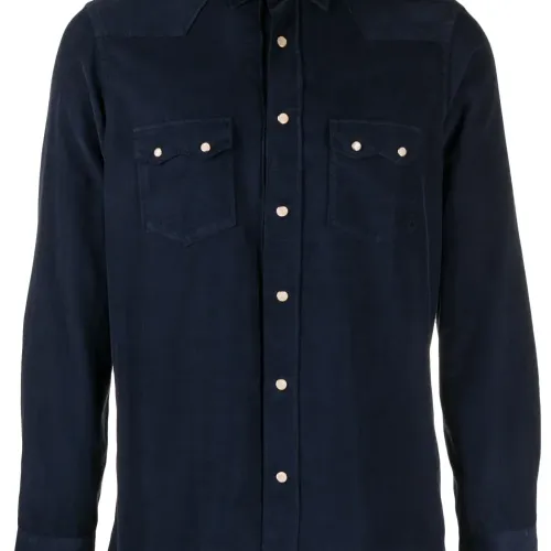 Темно-синий, хлопок, вельветовый материал, классический воротник, застежка на пуговицах спереди, длинные рукава, манжеты с застежкой на кнопки, два боковых кармана с застежкой на кнопки и закругленный подол.