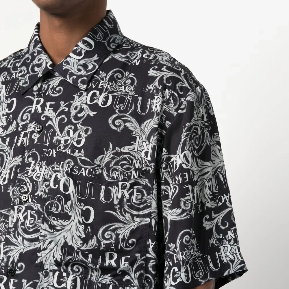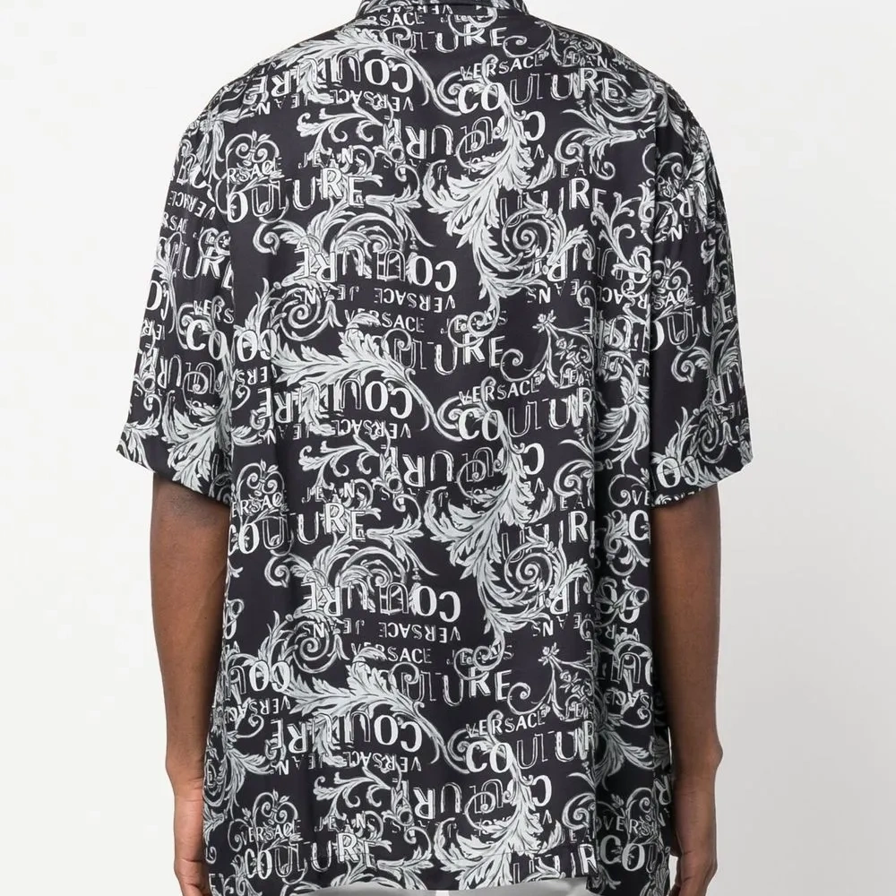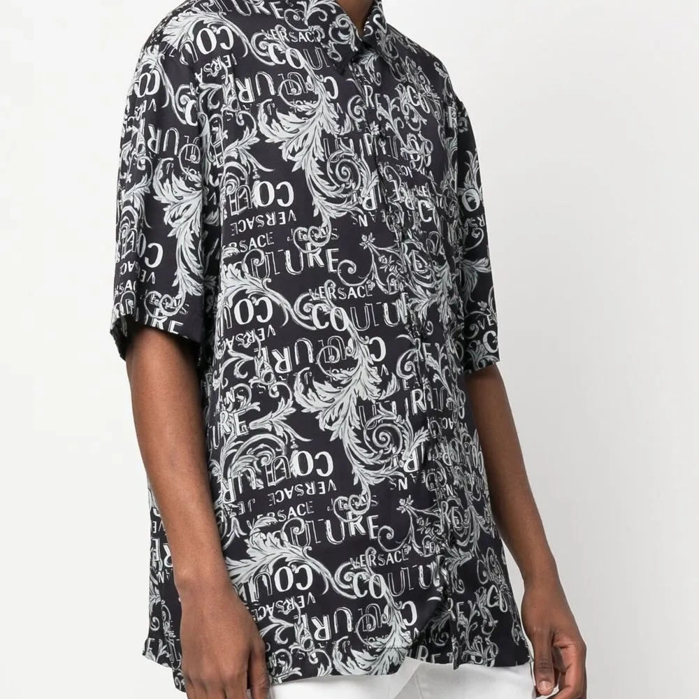 Черный/белый, серый, узор в стиле барокко, сплошной принт с логотипом, классический воротник, застежка на пуговицах спереди, короткие рукава, нагрудный накладной карман и закругленный подол.