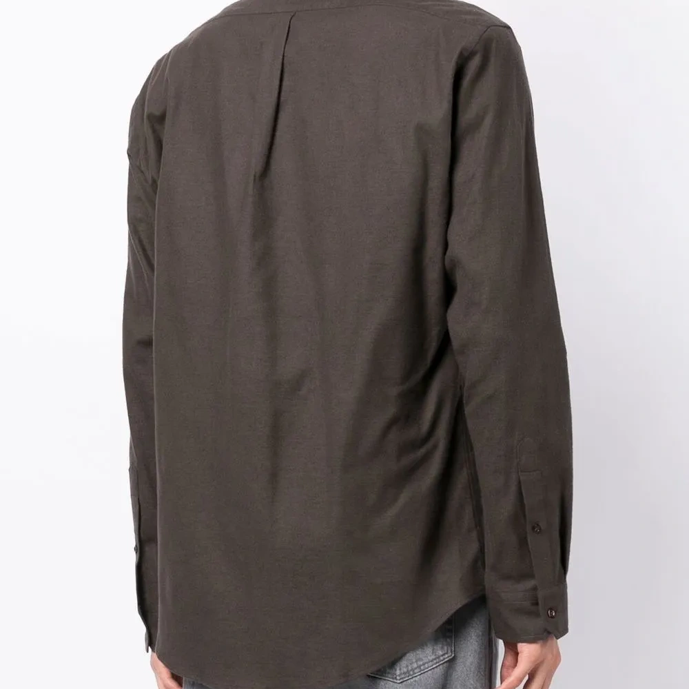 Коричневый, хлопок, классический воротник, длинные рукава, застежка на пуговицах спереди, ремешки и вышитый логотип.