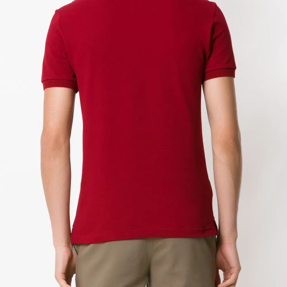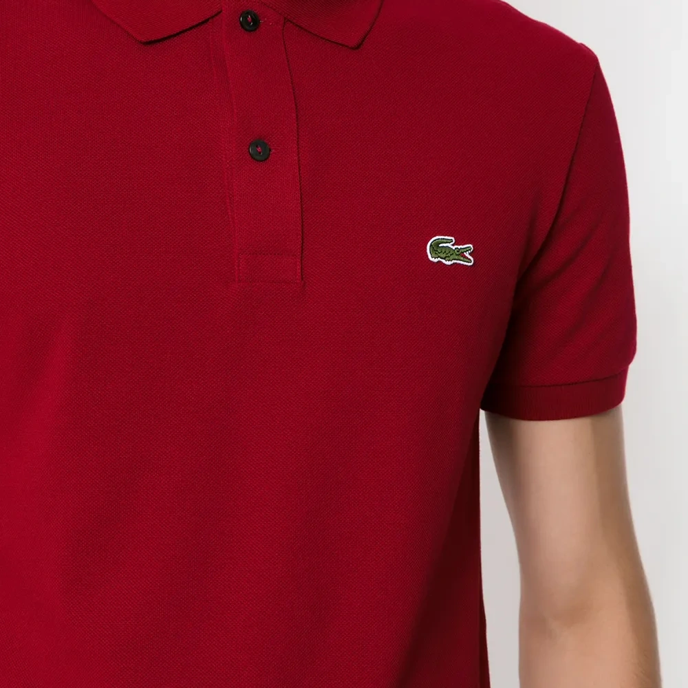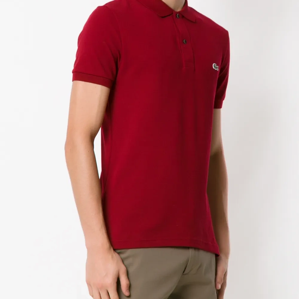 Рубашка поло с нашивкой-логотипом от Lacoste. Классический воротник-поло, планка на пуговицах спереди, короткие рукава, манжеты в рубчик и прямой подол. Цвет: красный.