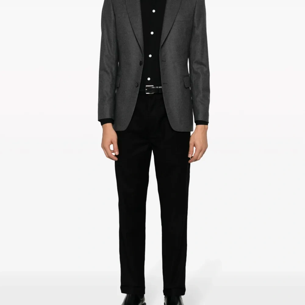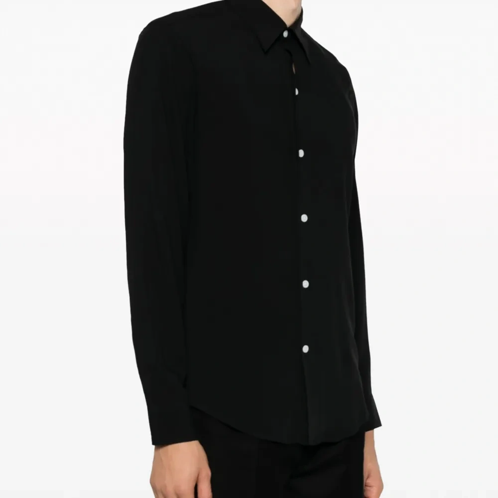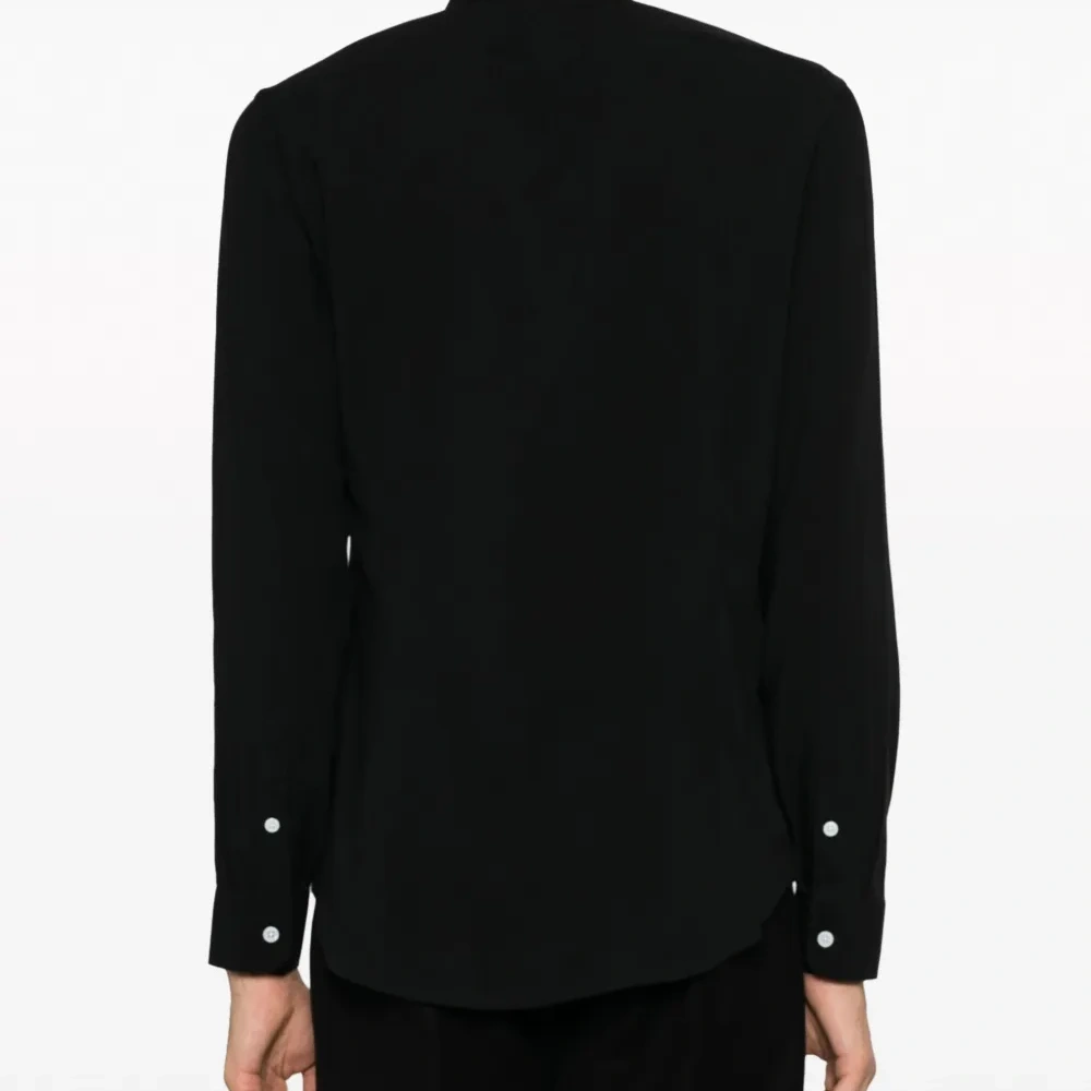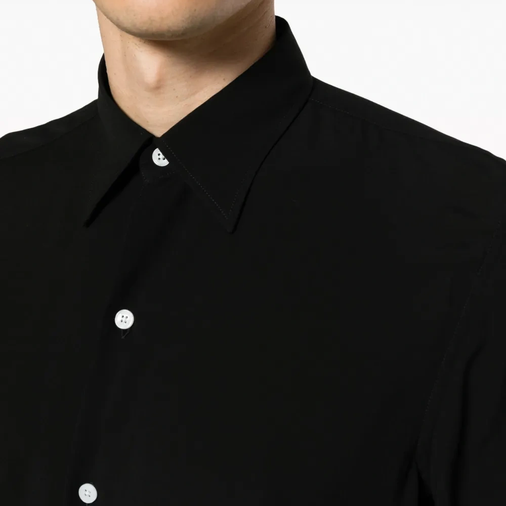 Черный, плоский заостренный воротник, застежка на пуговицах спереди, рубашечные рукава и закругленный подол.