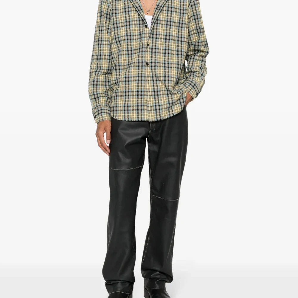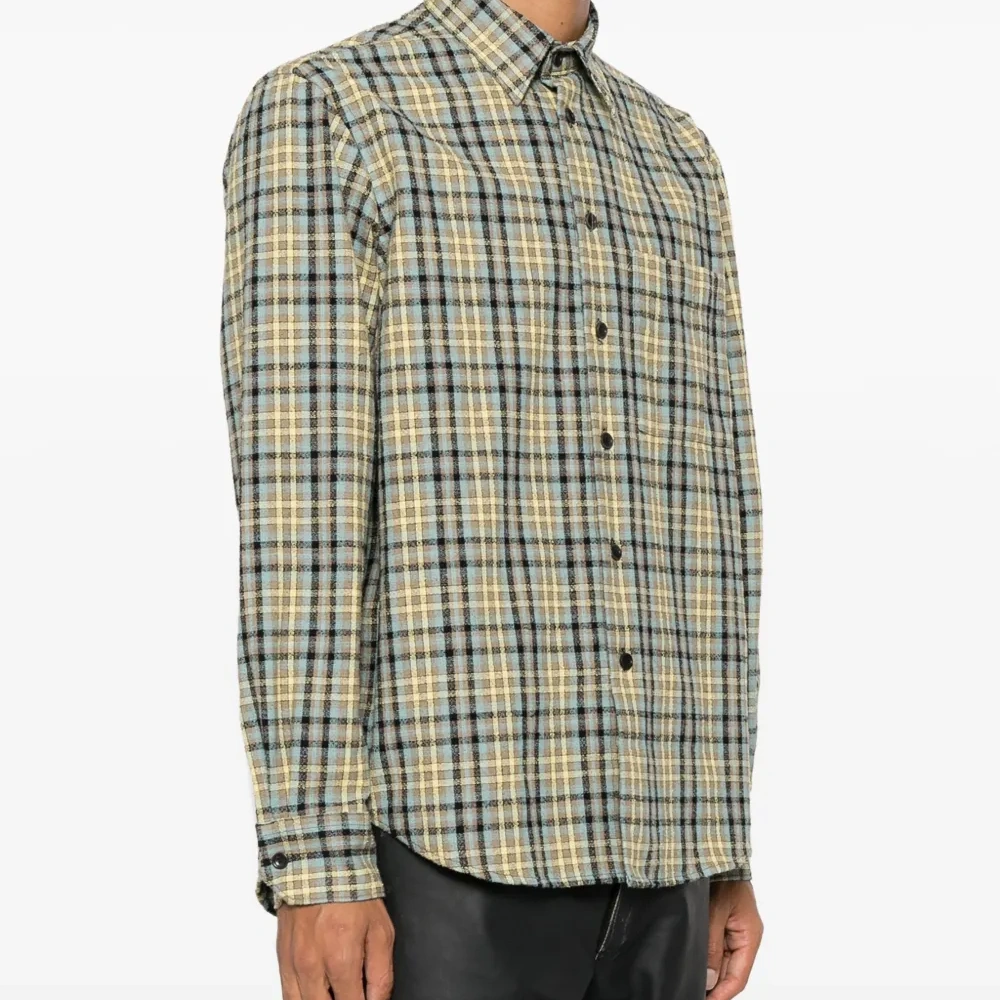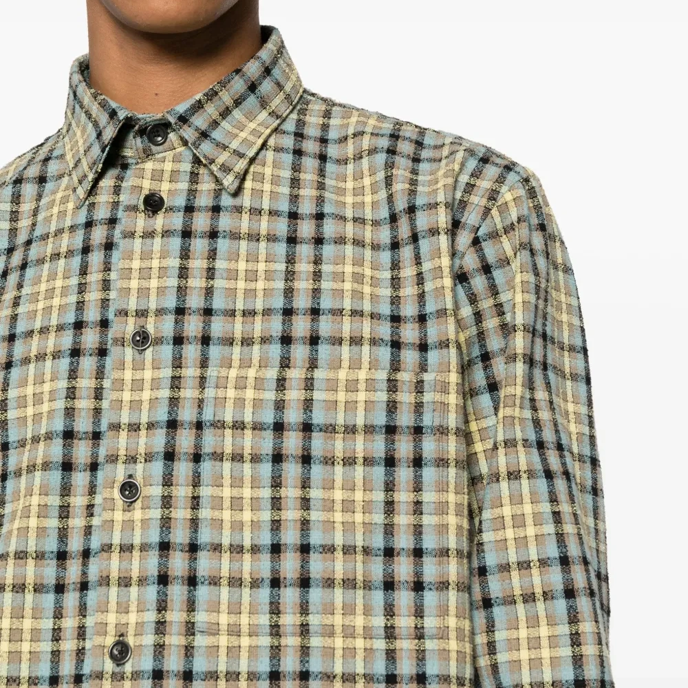 Ярко-желтый, темно-синий, смесовый хлопок, клетчатый узор, классический воротник, застежка на пуговицах спереди, длинные рукава, рукава с манжетами на пуговицах и закругленный подол.