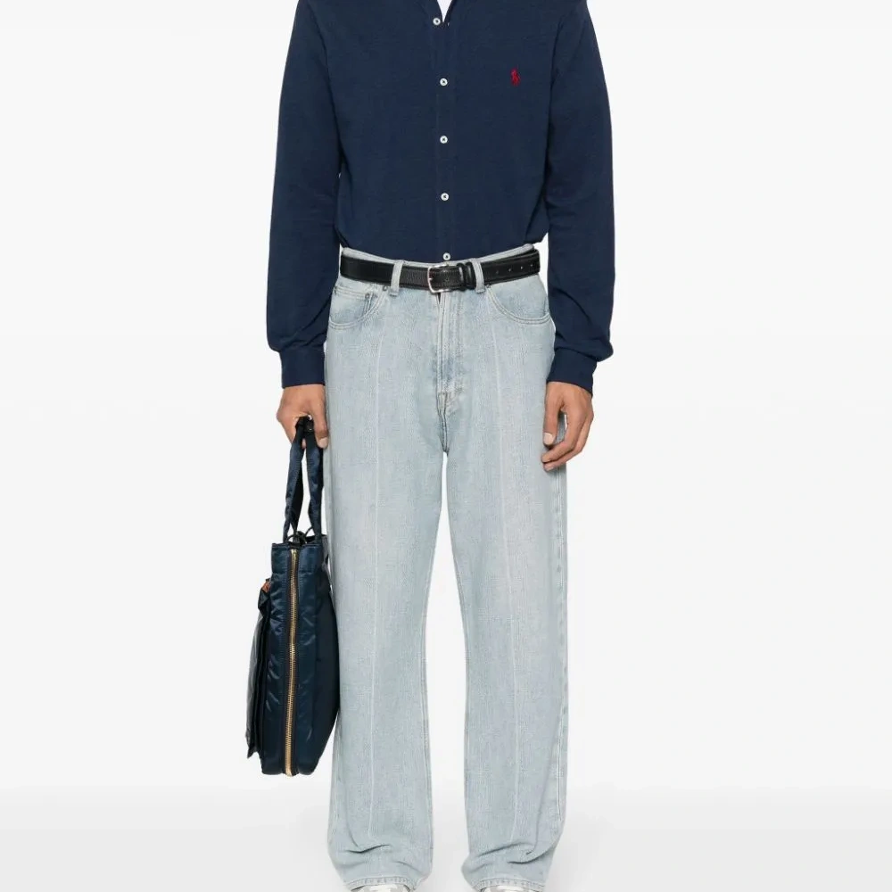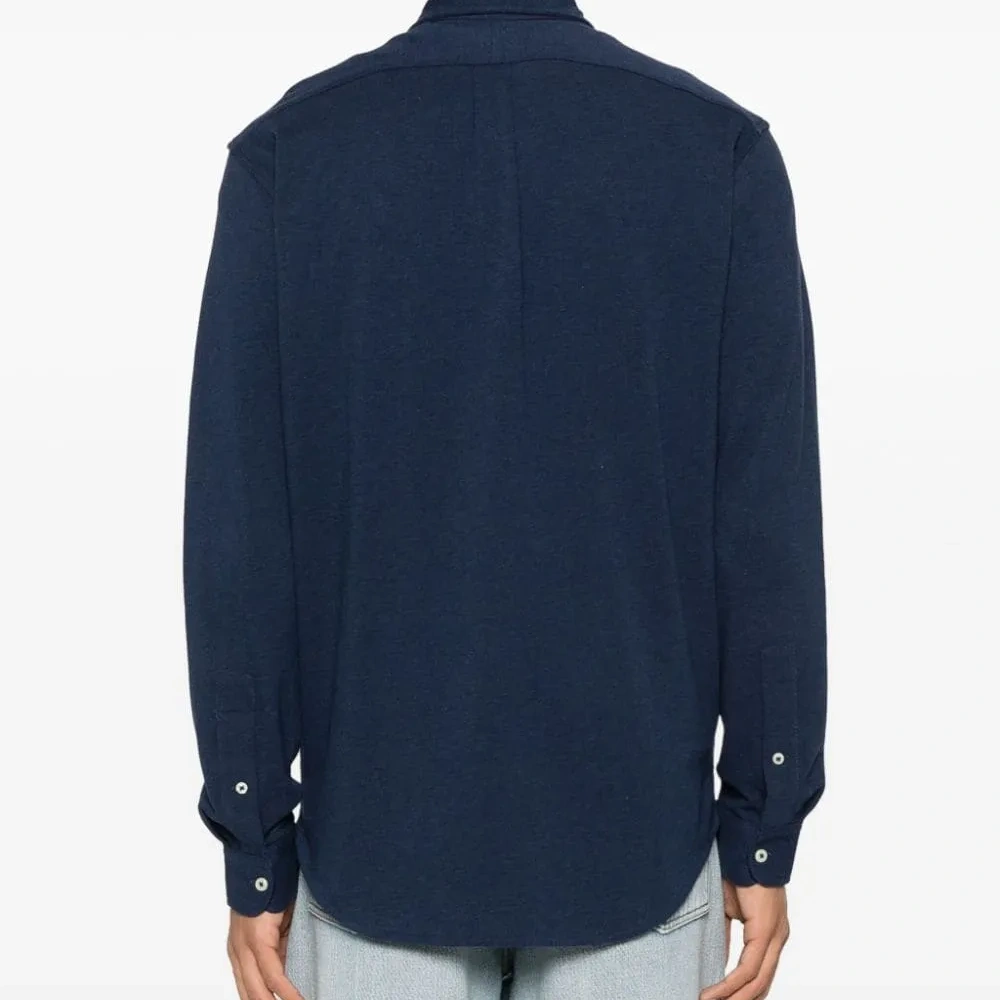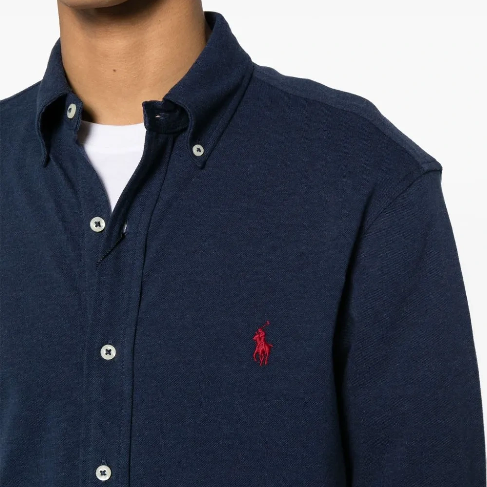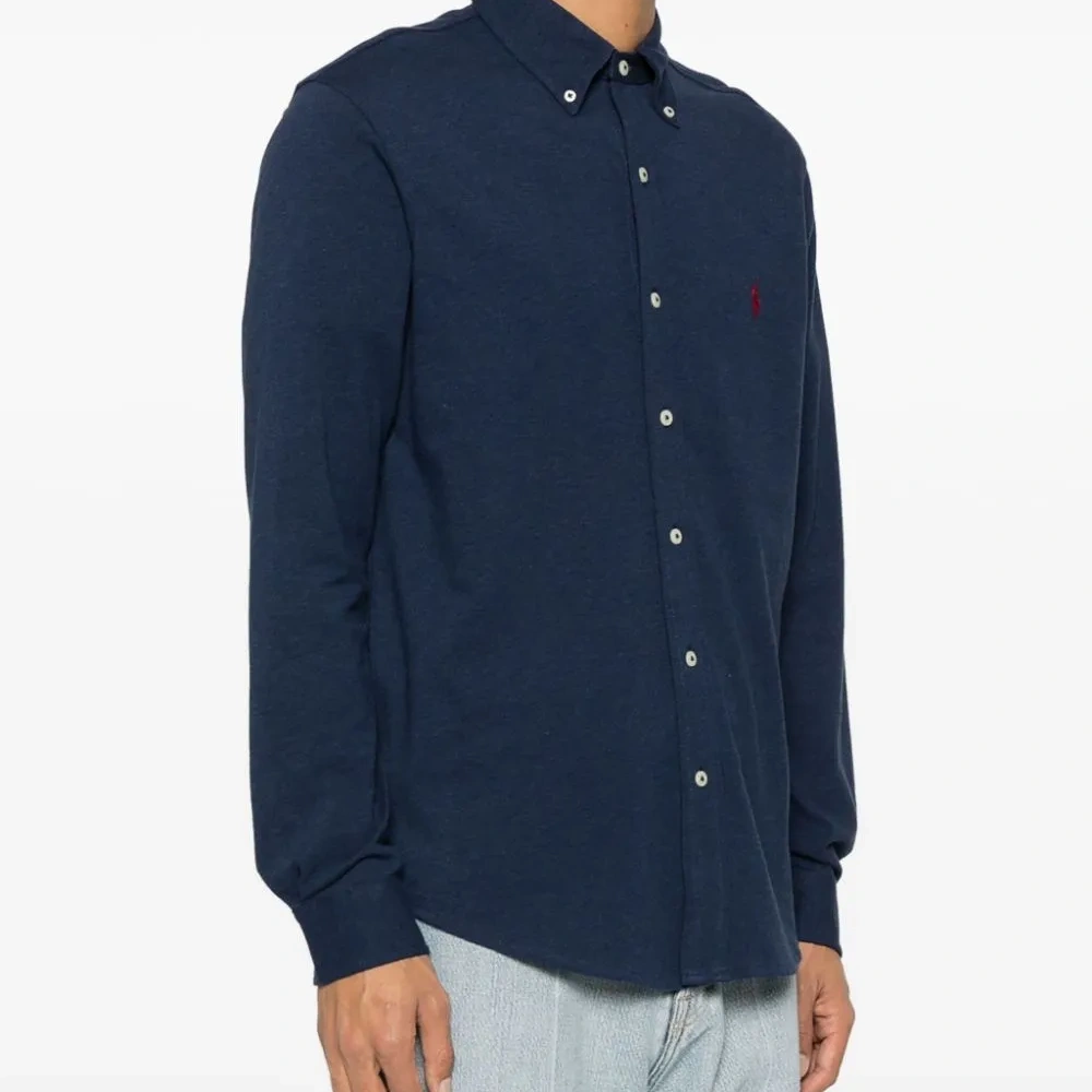 Темно-синий, красный, хлопок, вышитый логотип на груди, знаковый логотип Polo Pony, воротник на пуговицах, застежка на пуговицах спереди, манжеты на пуговицах, длинные рукава и закругленный подол.