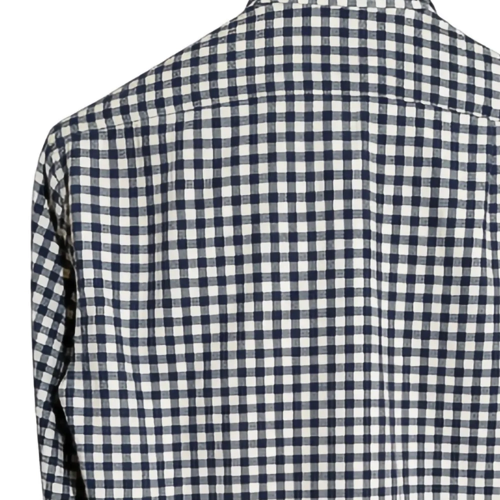 синий и белый клетчатый принт, застежка на пуговицы, длинные рукава, манжеты на пуговицах, классический воротник