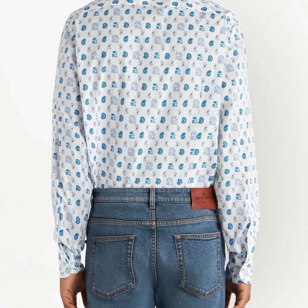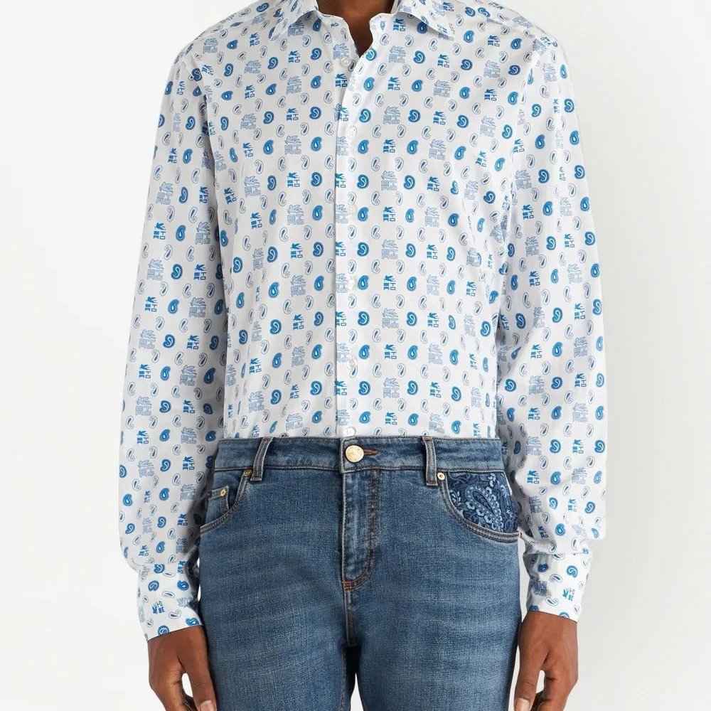 Смесовый хлопок, абстрактный принт, классический воротник, застежка на пуговицах спереди и длинные рукава.