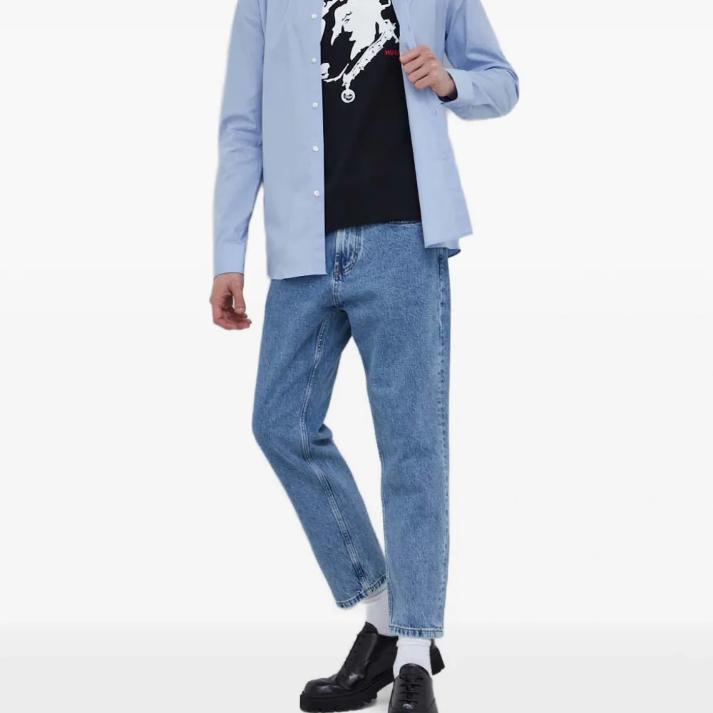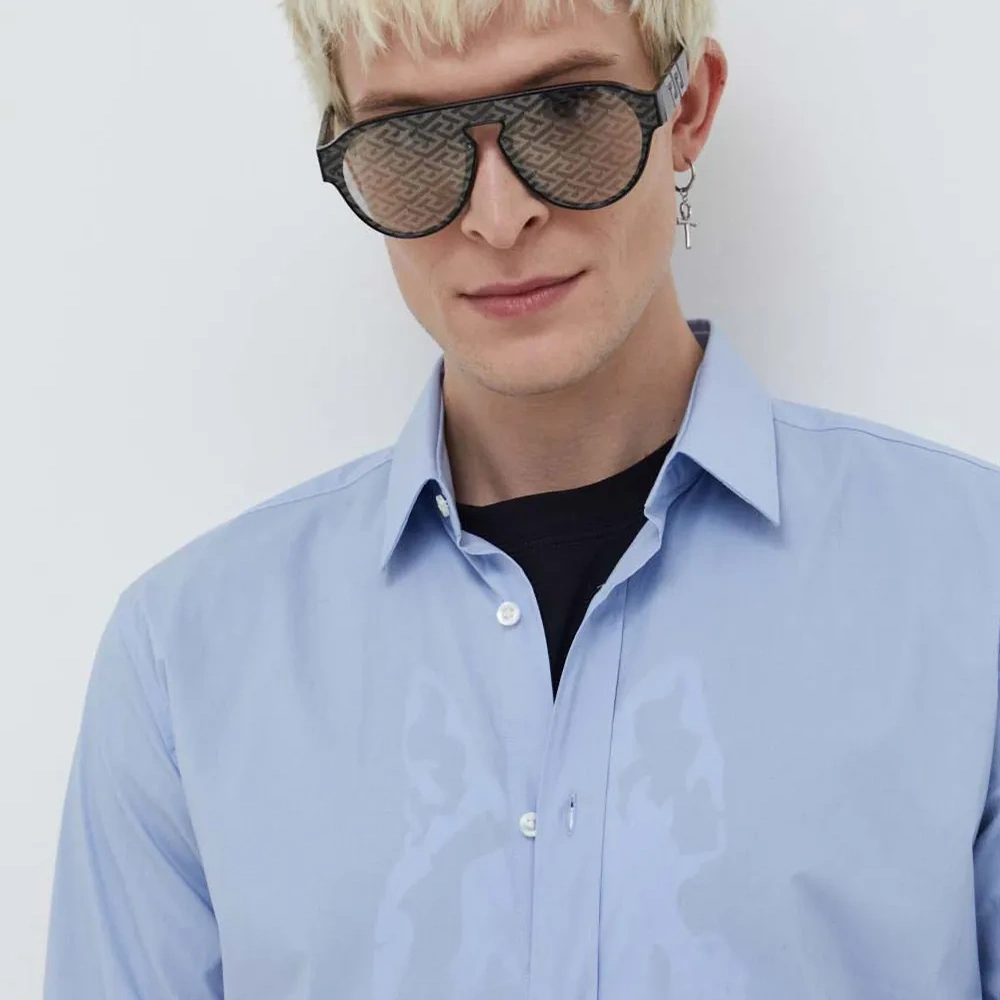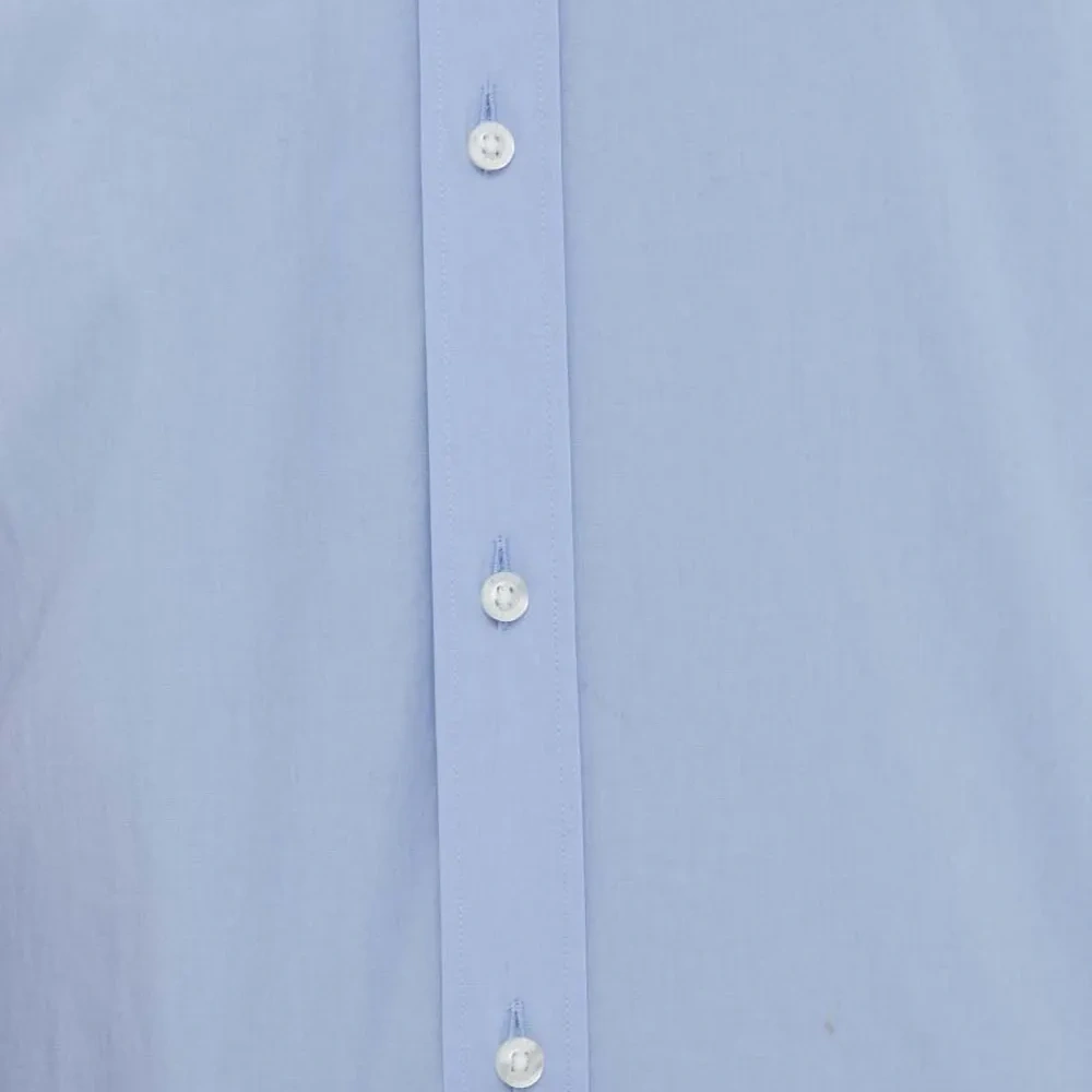 светло-голубая рубашка с застёжкой на пуговицы, отложным воротником, длинными рукавами и манжетами на пуговицах