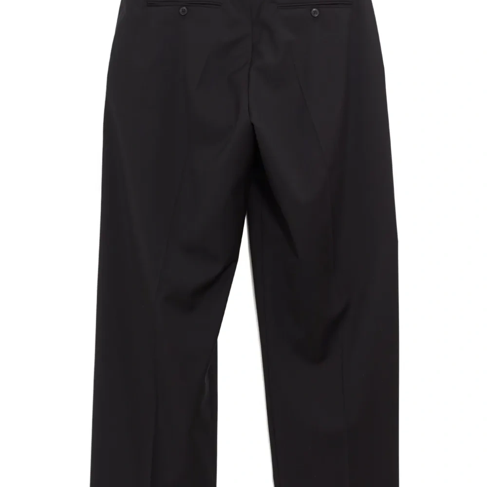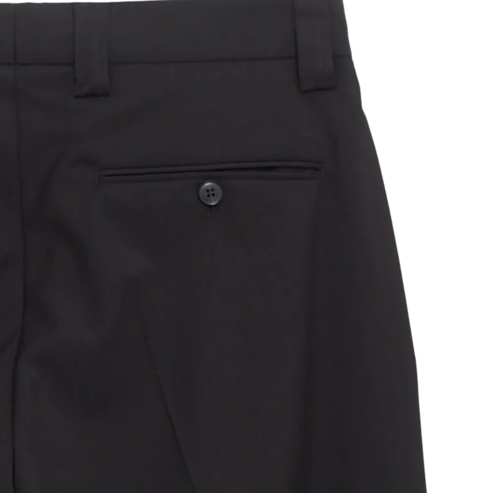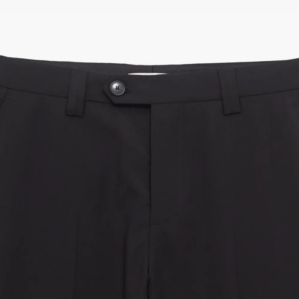 черные шлевки для ремня, застежка на пуговицу, задние прорезные карманы, прямые брюки