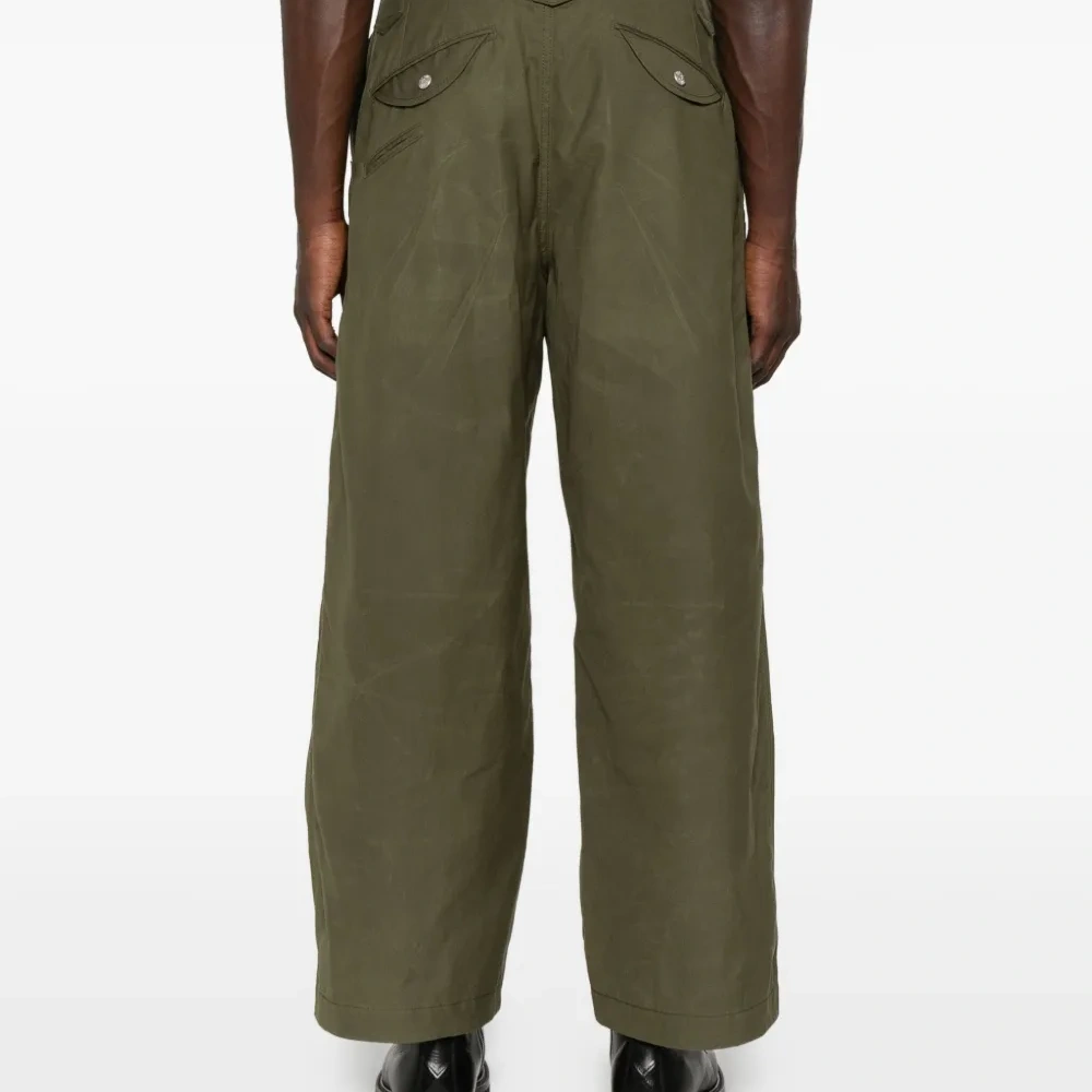 оливково-зеленый цвет, стеганый ромбами, украшения заклёпками, накладные карманы с клапанами, складки спереди, застёжка на пуговицы