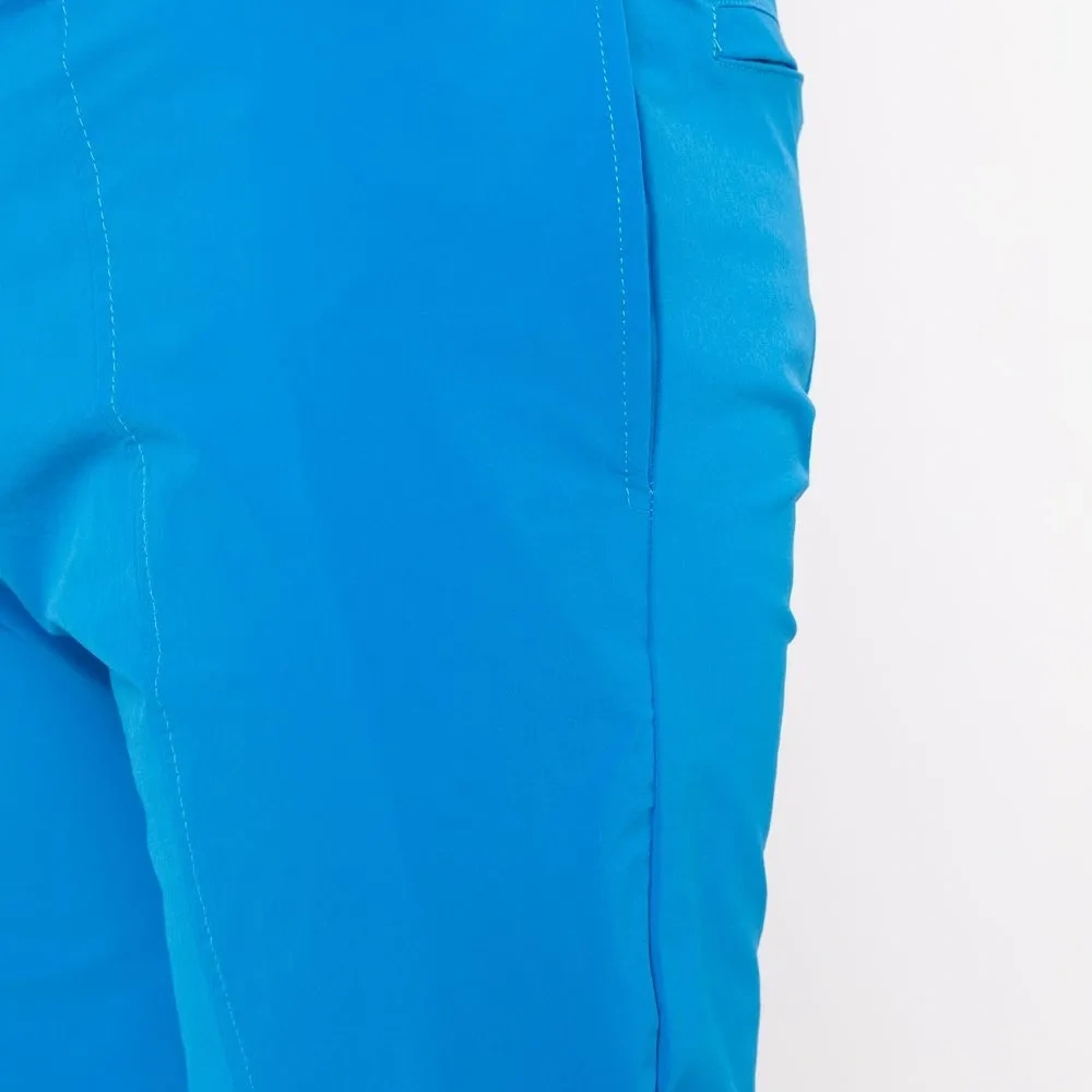 Синий, петли для ремня, потайная молния спереди, два прорезных кармана по бокам, два кармана с листочкой сзади, узкий крой и низкая посадка.
