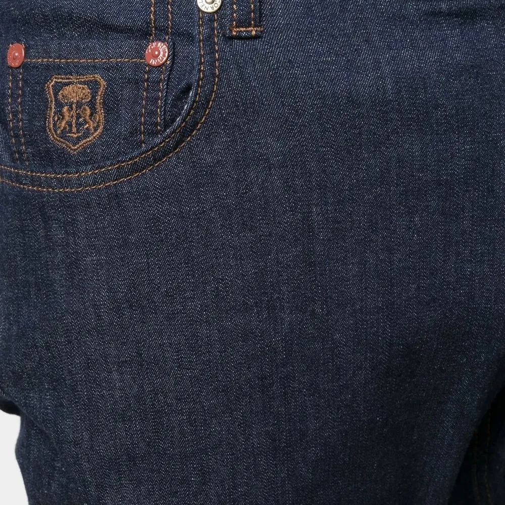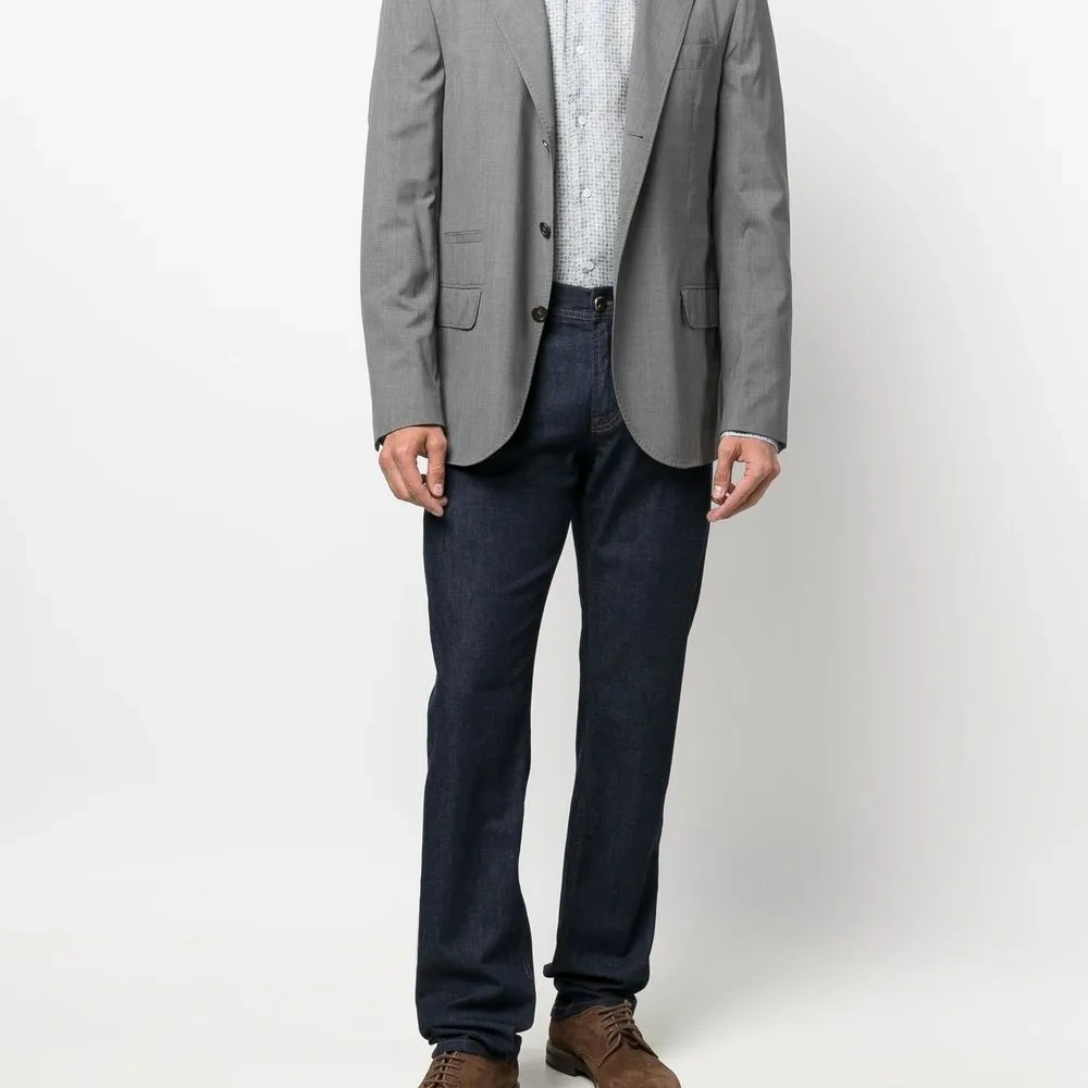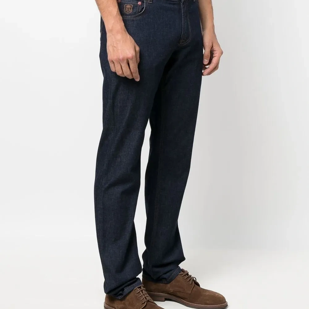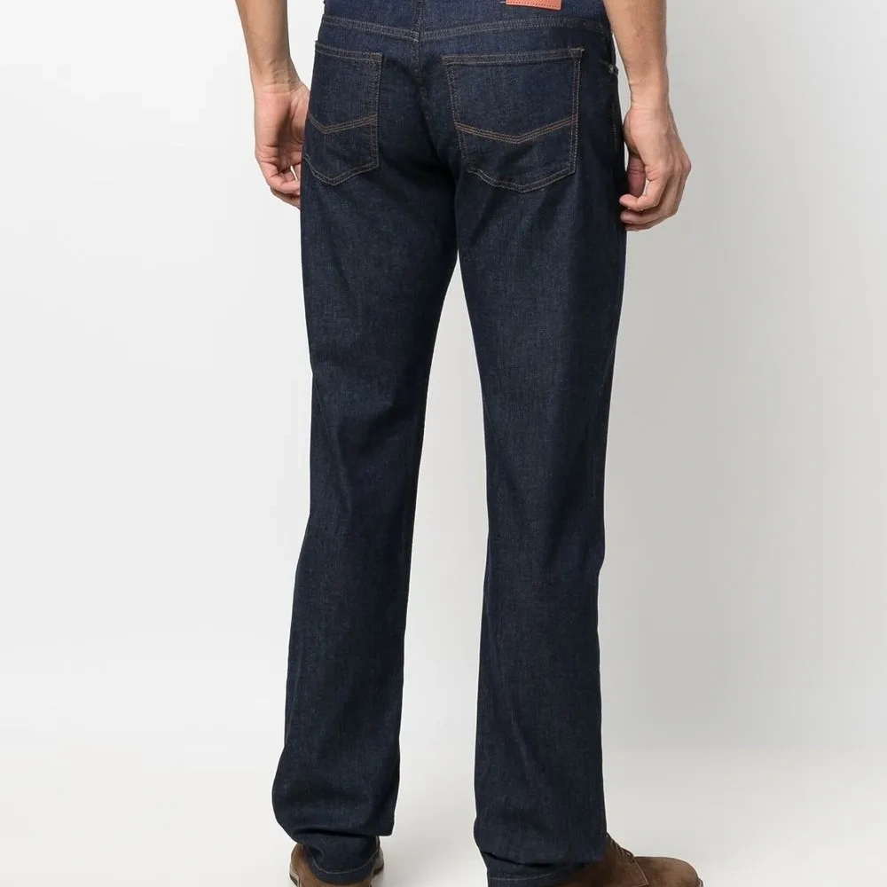 Петли для ремня, застежка на молнии и пуговице спереди и классическая пятикарманная модель.