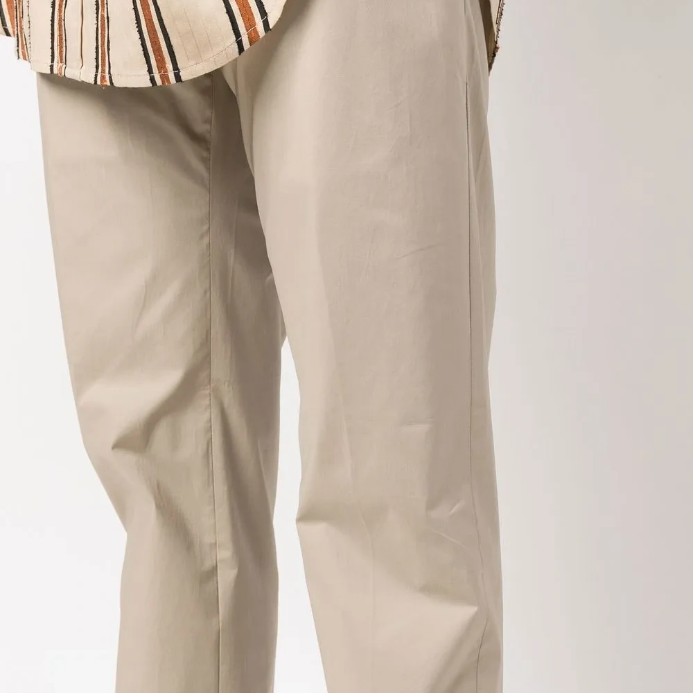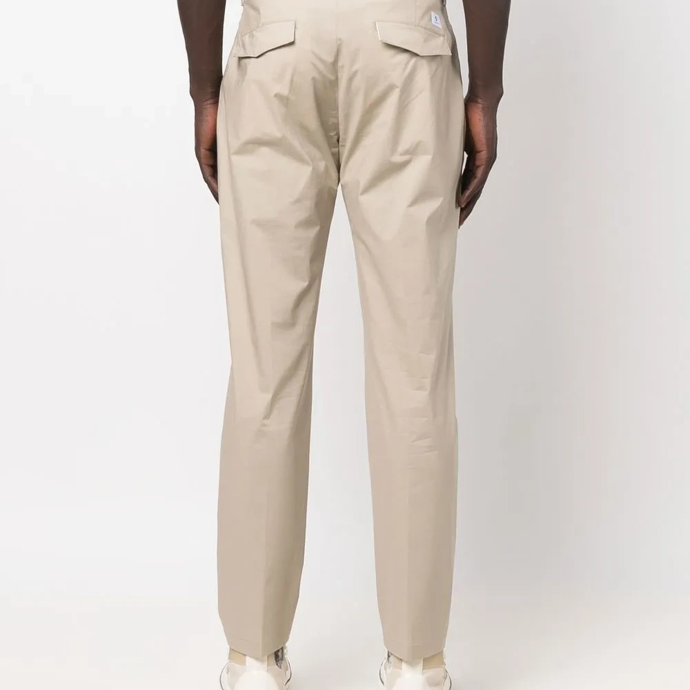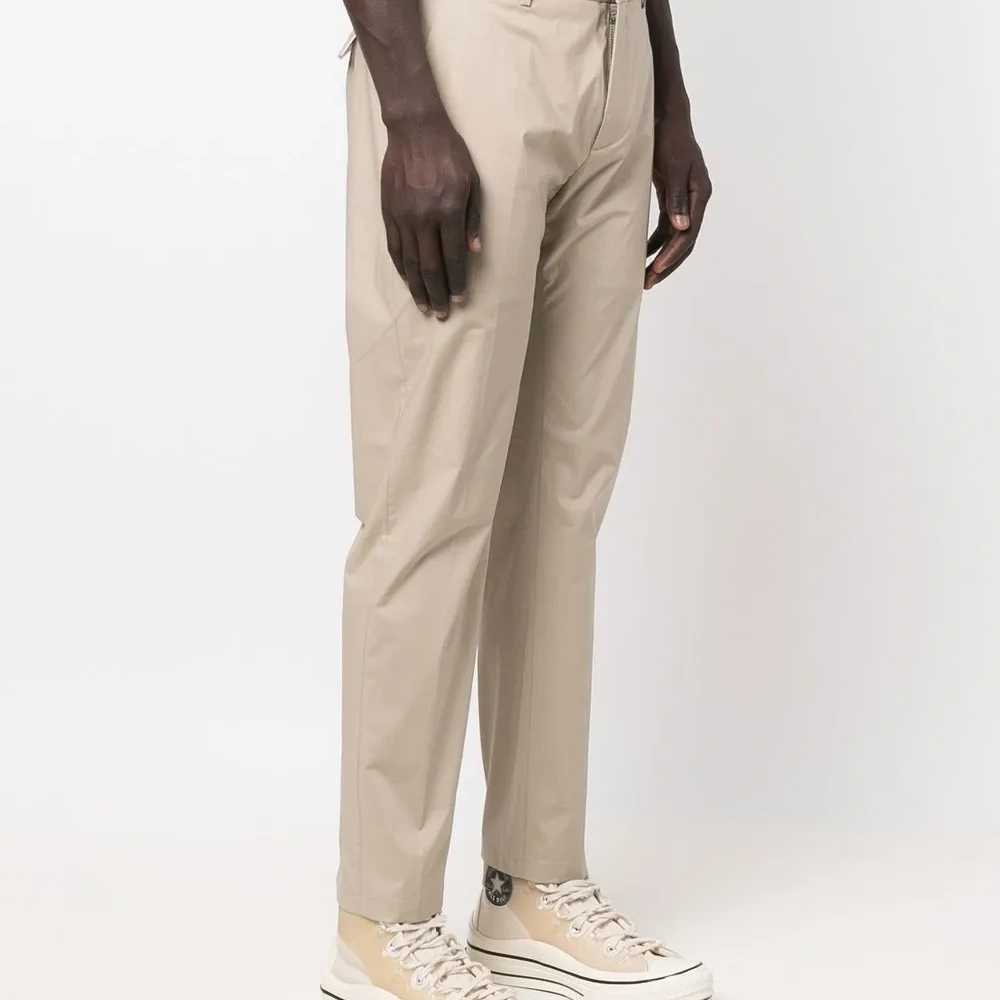 Средняя посадка, петли для ремня, застежка на молнии и пуговице спереди, два вшитых кармана по бокам, два кармана с клапанами сзади и узкий крой.