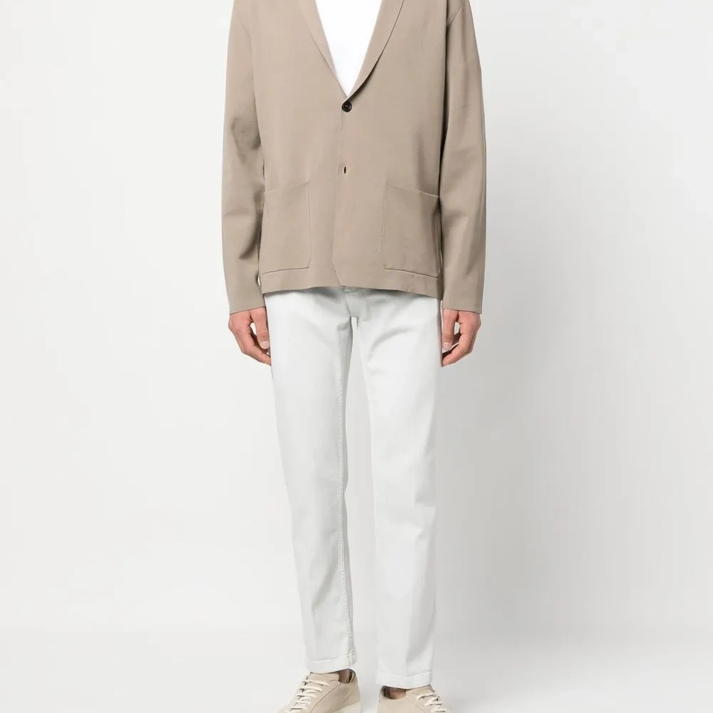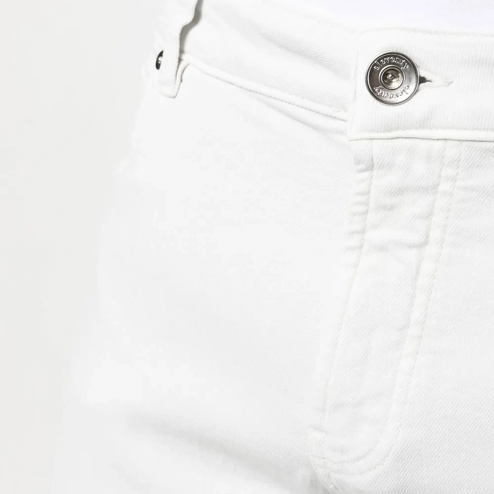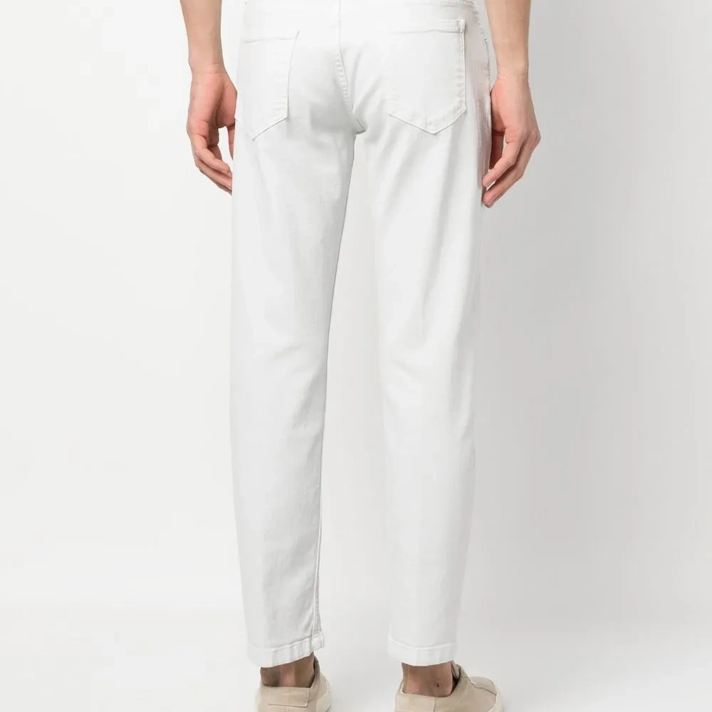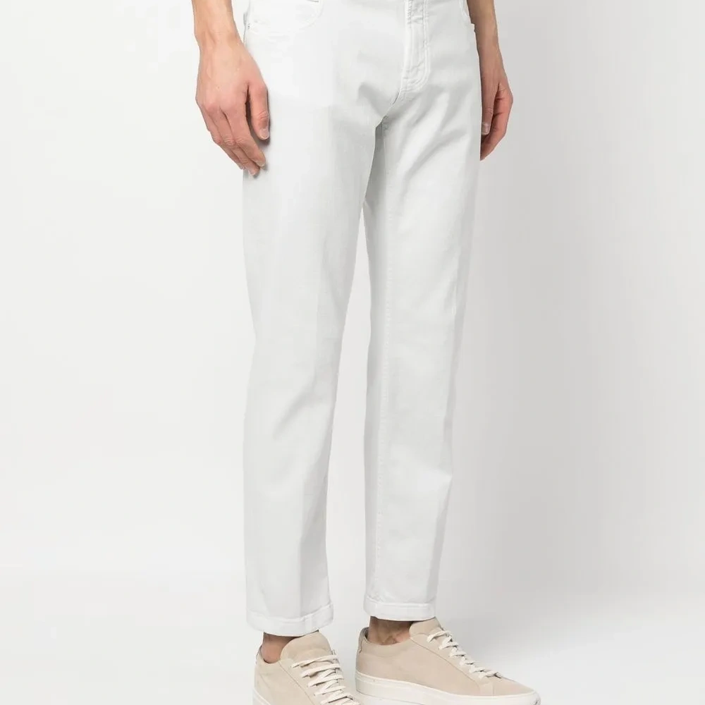 Кремовый, эластичный хлопок, средняя посадка, петли для ремня, застежка на молнии и пуговице спереди, пять карманов и прямой крой.