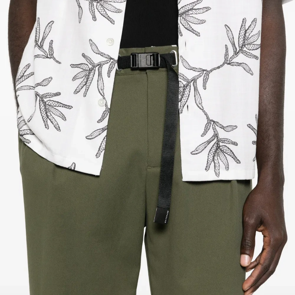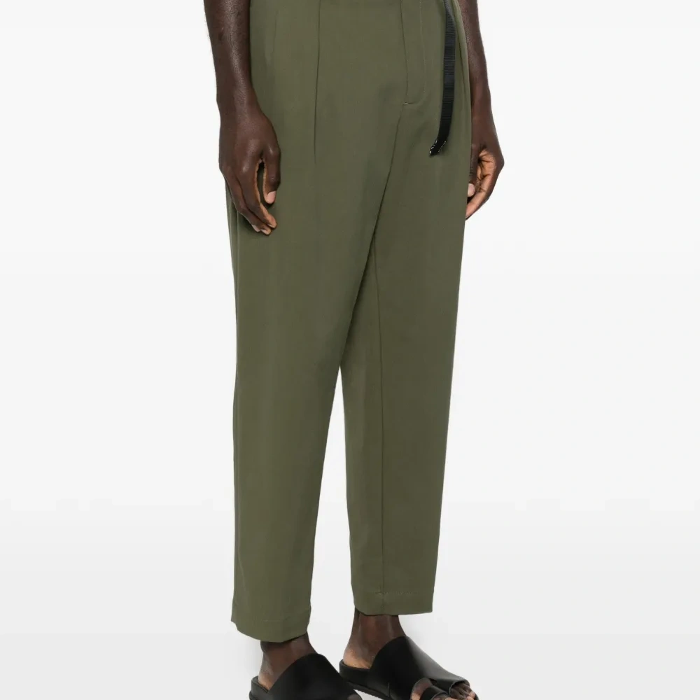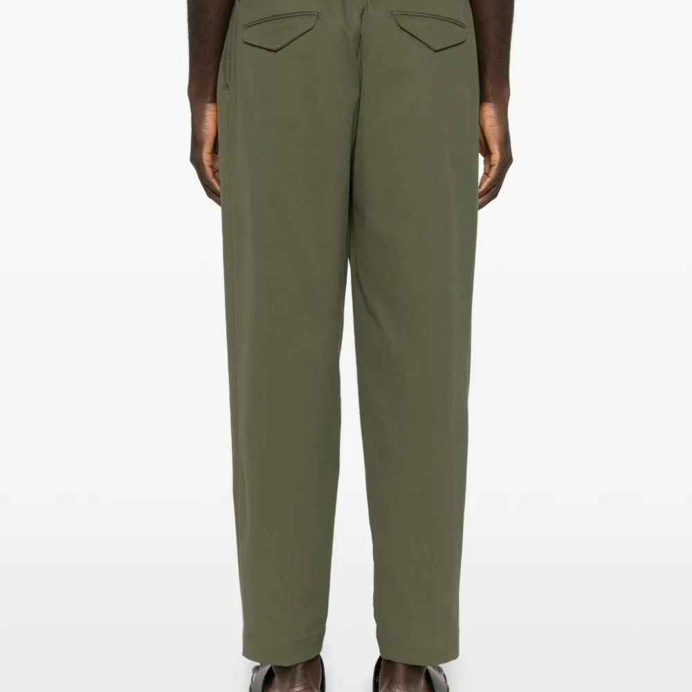 зелёная саржа, интегрированный пояс, складки спереди, карманы по бокам и сзади