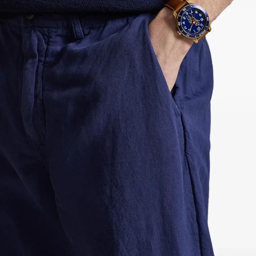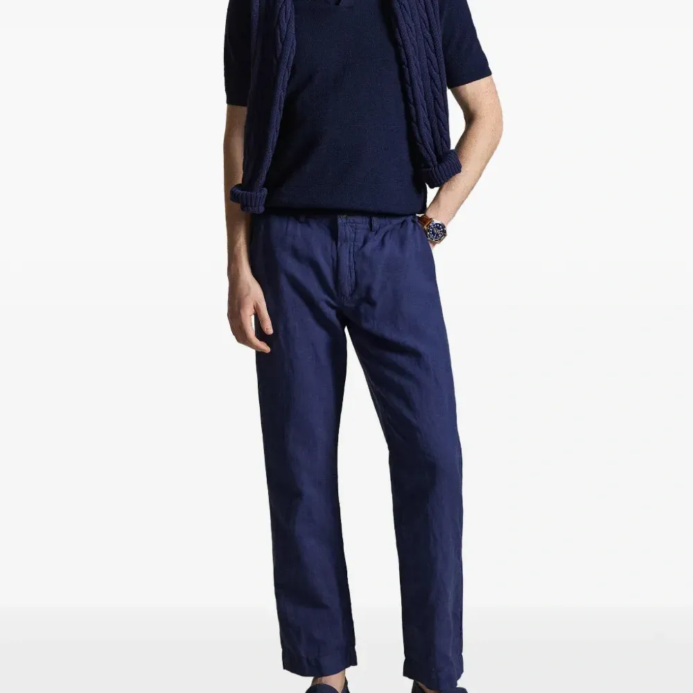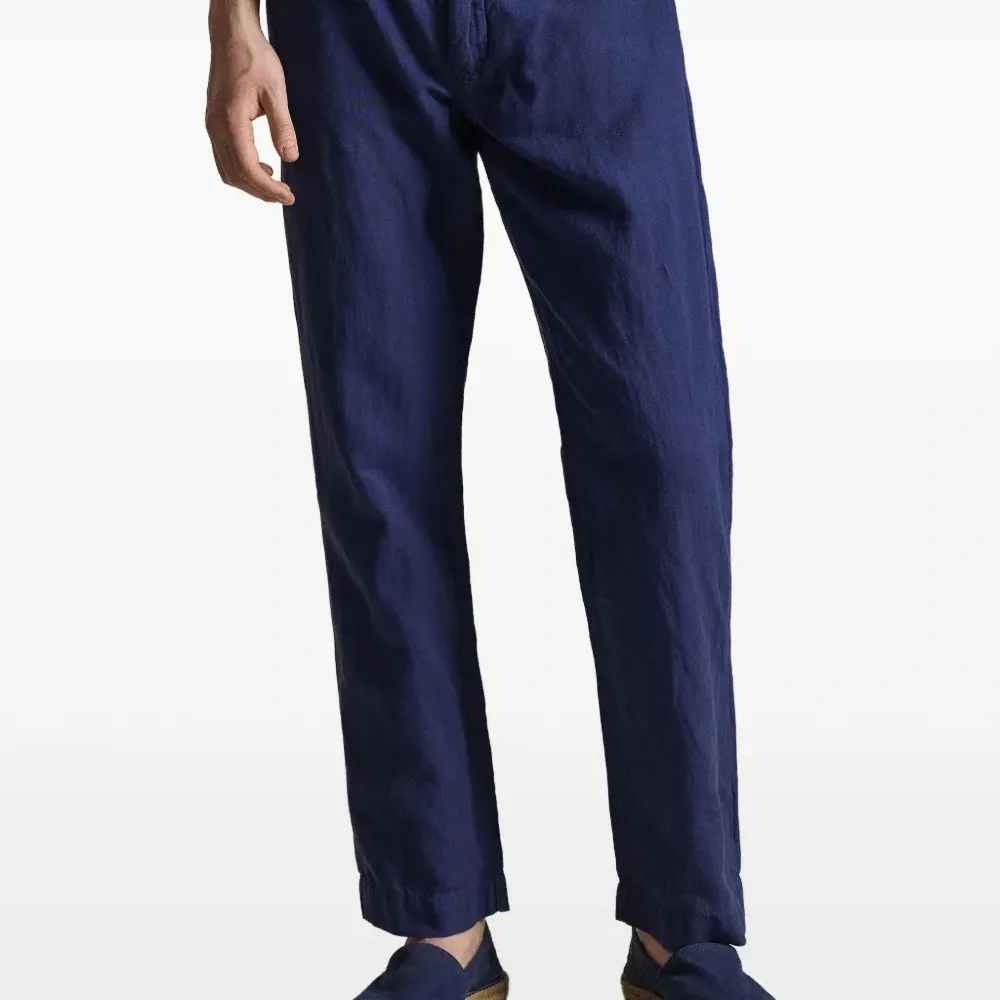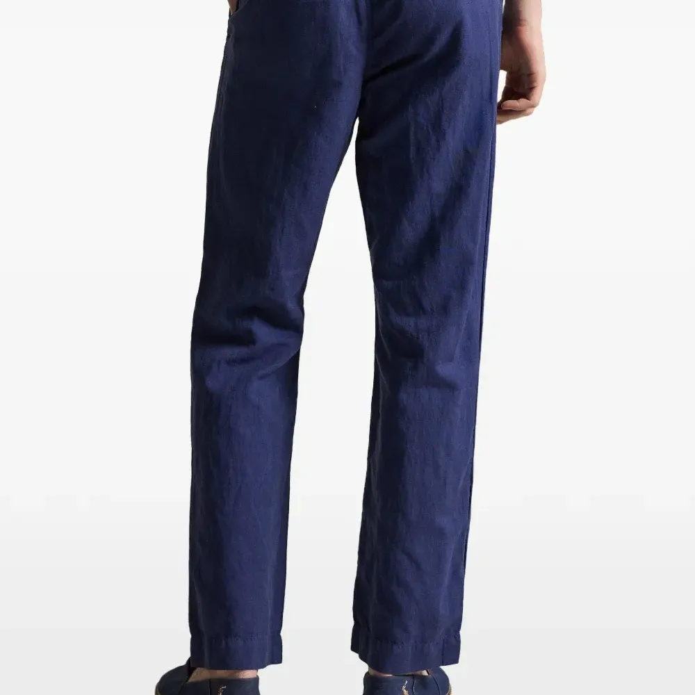 темно-синие шлевки для ремня, застежка-молния, карманы на пуговицах, вышитый логотип
