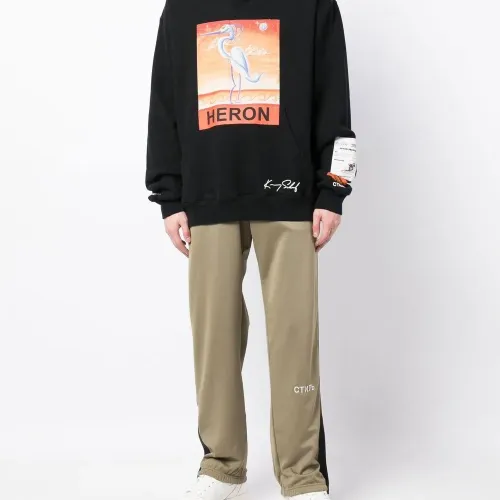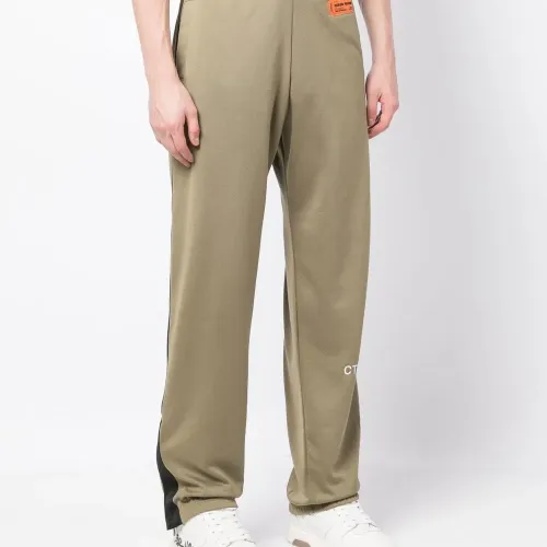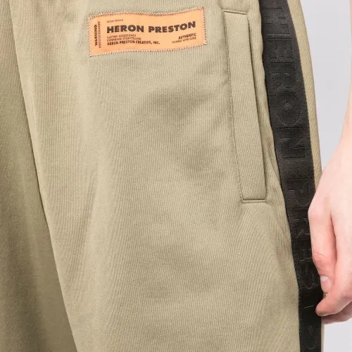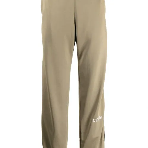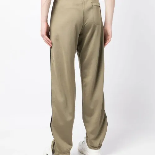 Хаки, смесовый хлопок, эластичный пояс, нашивка с логотипом спереди, два боковых кармана с листочкой, полоска сбоку, эластичные манжеты и задние карманы с листочкой.