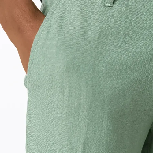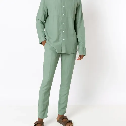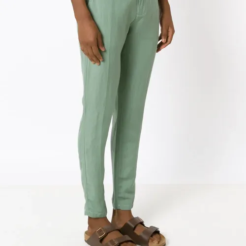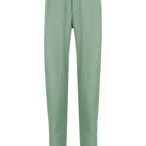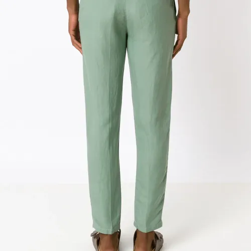 Средняя посадка, петли для ремня, застежка на молнии и пуговице спереди, два прорезных кармана по бокам, два кармана с листочкой сзади и прямой крой.