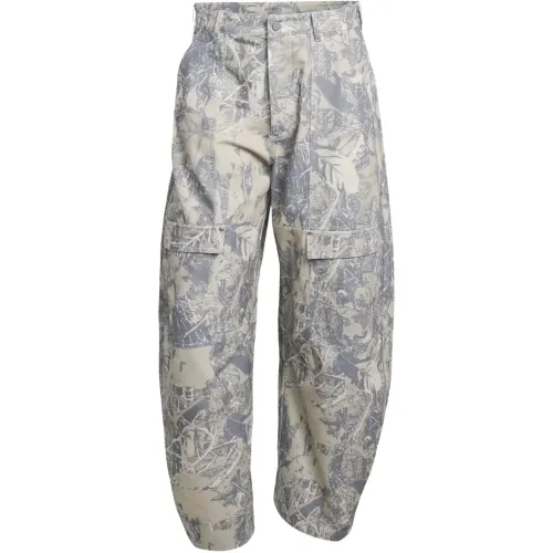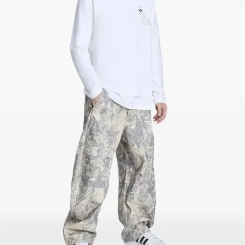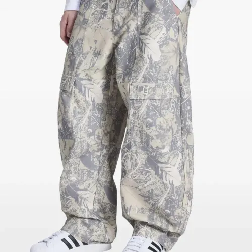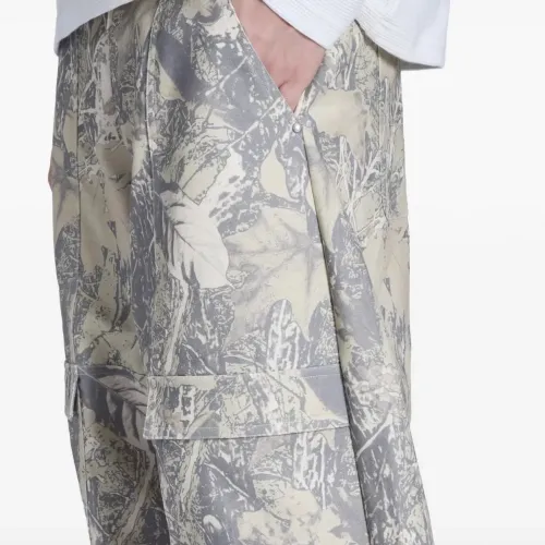 серо-бежевые брюки с листовым принтом и накладными карманами