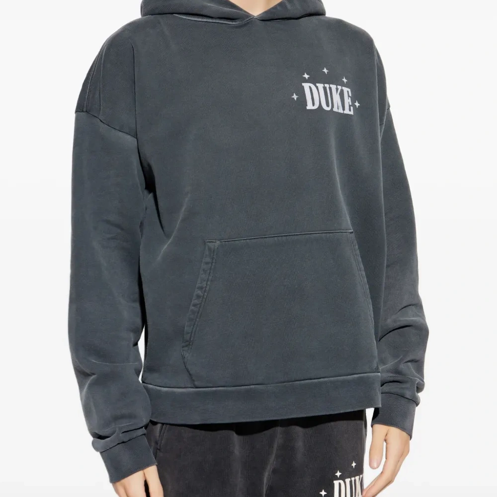 выцветшее чёрное худи с капюшоном, передним карманом-кенгуру и принтом с логотипом