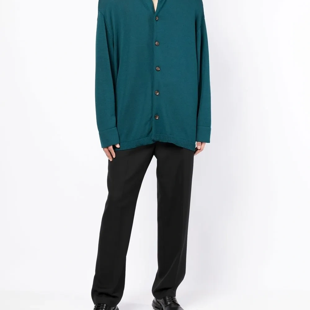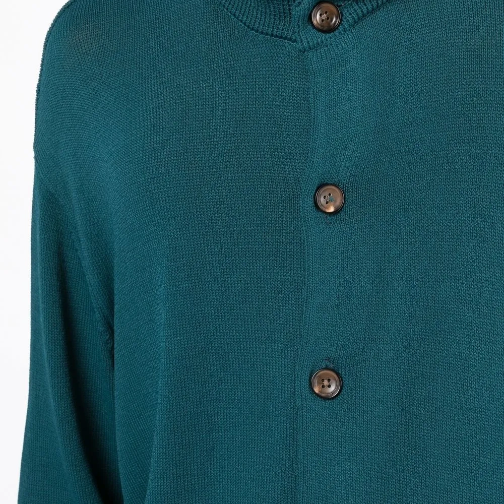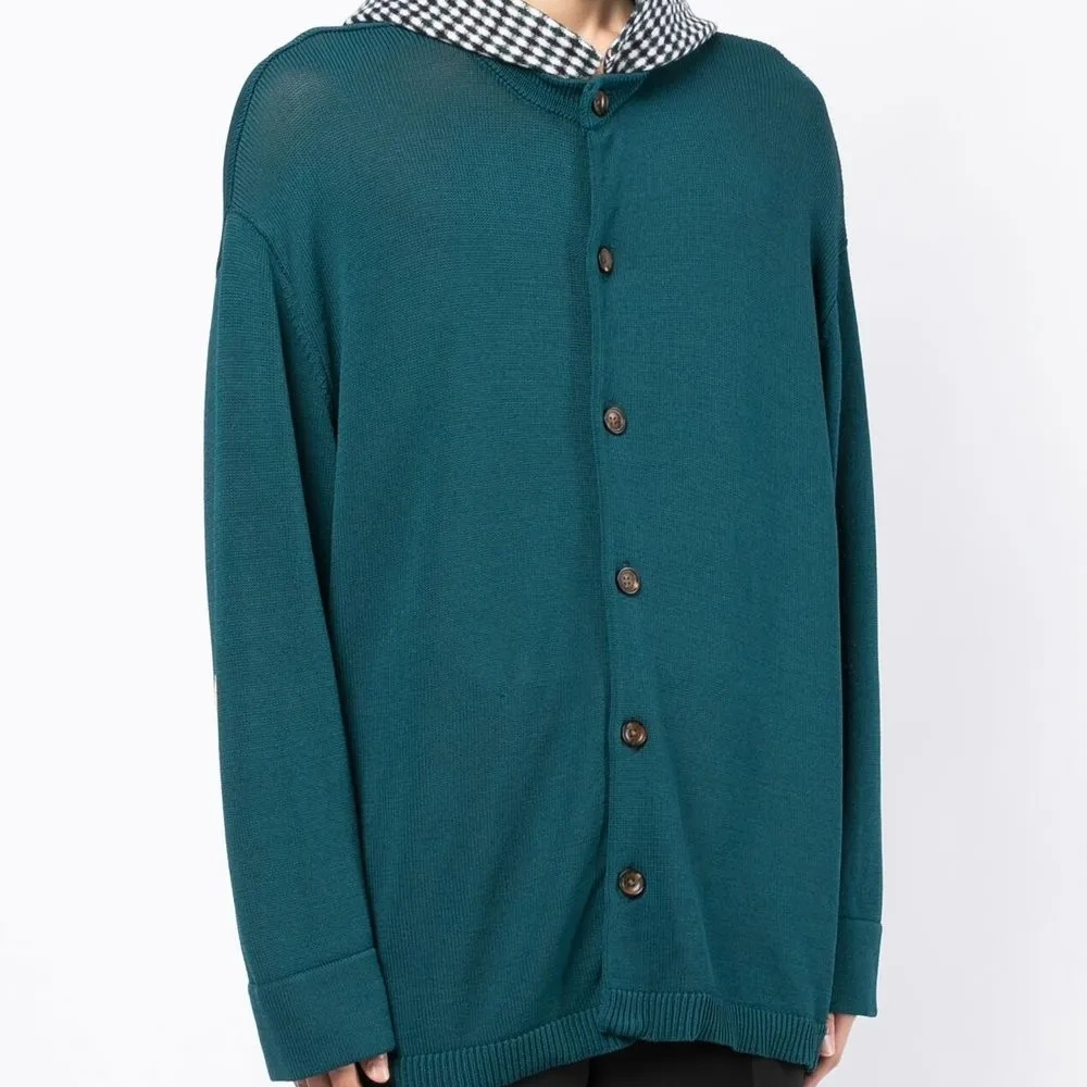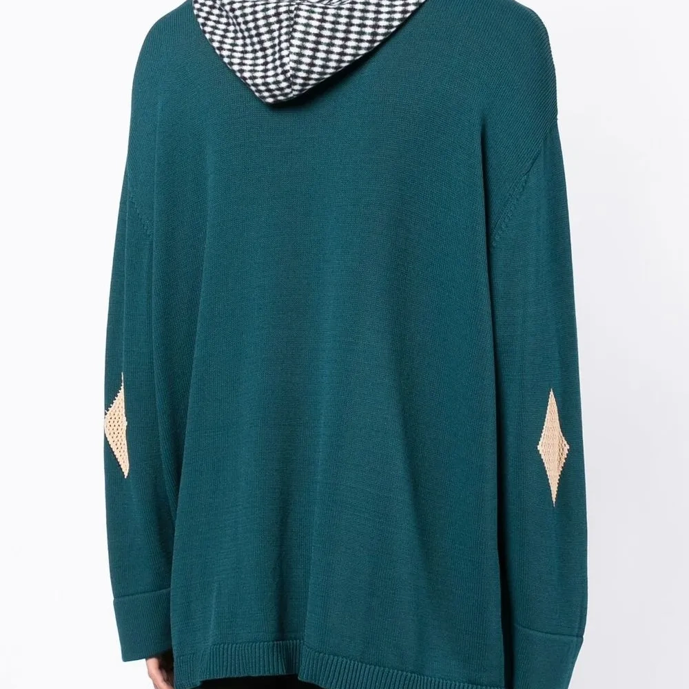 Бирюза, трикотаж в рубчик, принт с узором аргайл, классический капюшон, застежка на пуговицах спереди, длинные рукава и прямой подол.