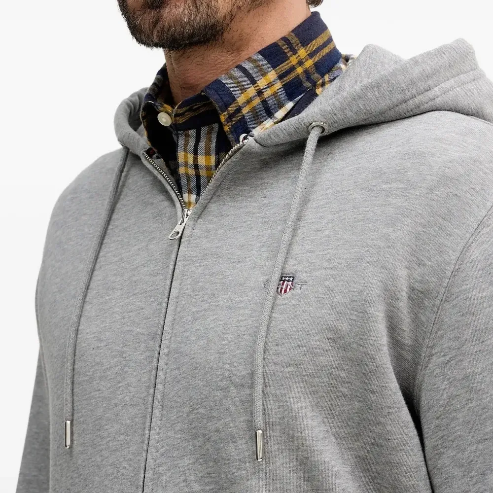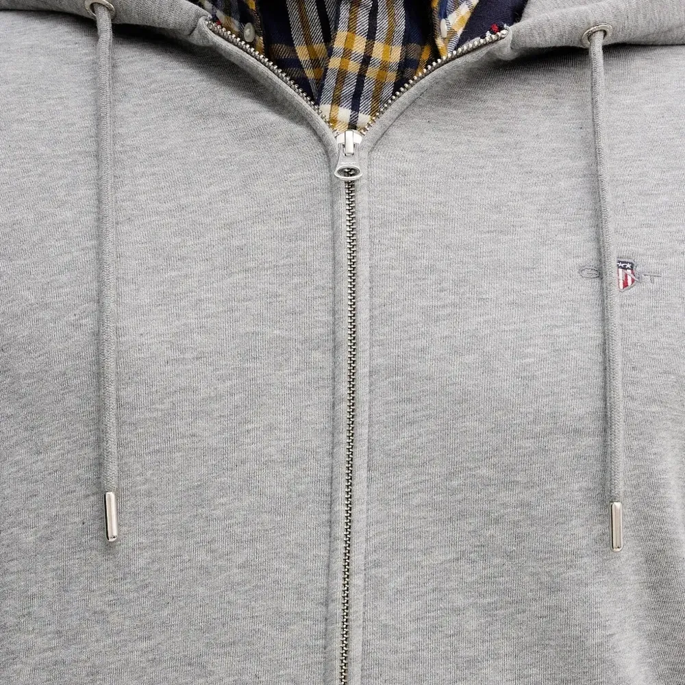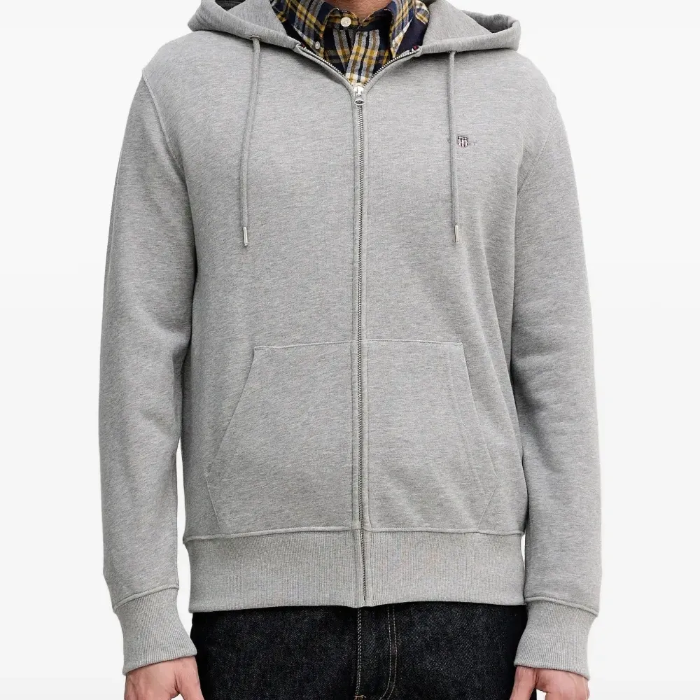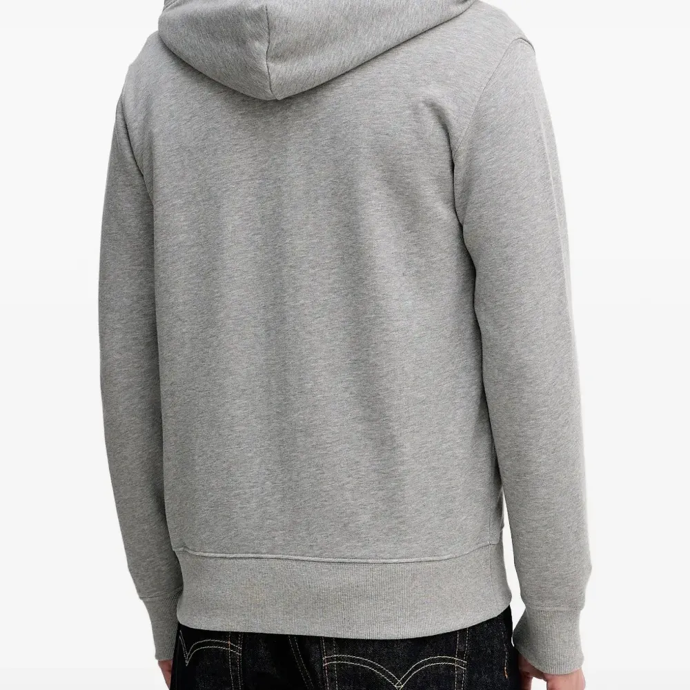 серая толстовка с капюшоном, застежкой-молнией спереди, логотипом на груди, передним накладным карманом и кулиской на капюшоне