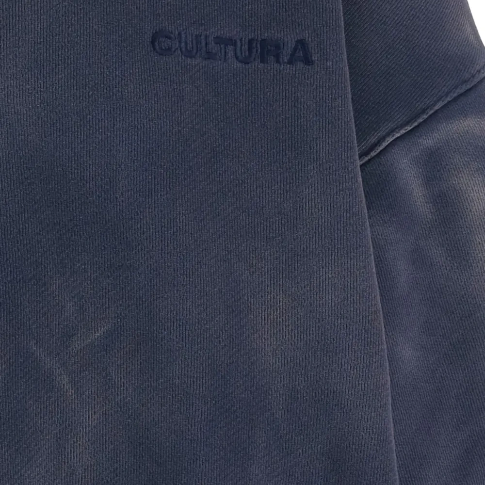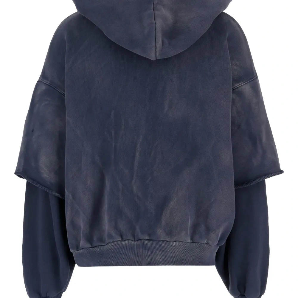 синий худи с эффектом вываренной ткани, тон в тон вышитым логотипом, двойными рукавами и ребристыми краями
