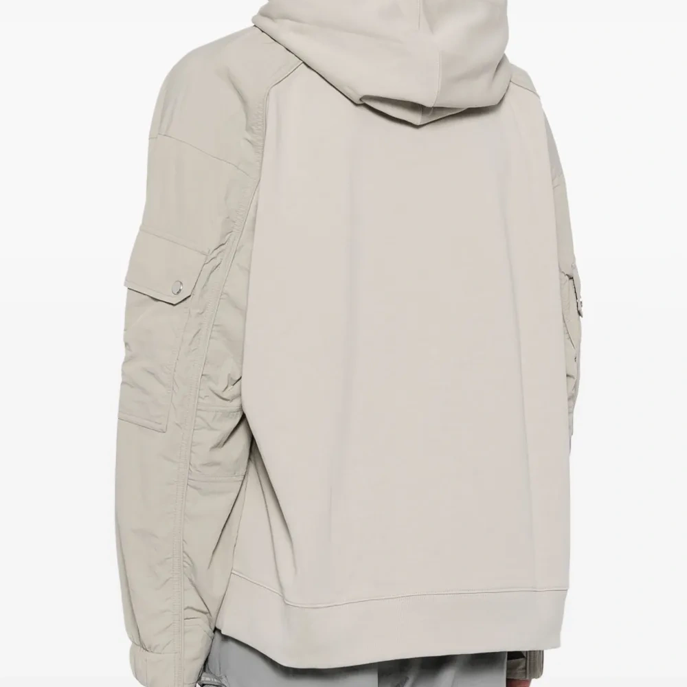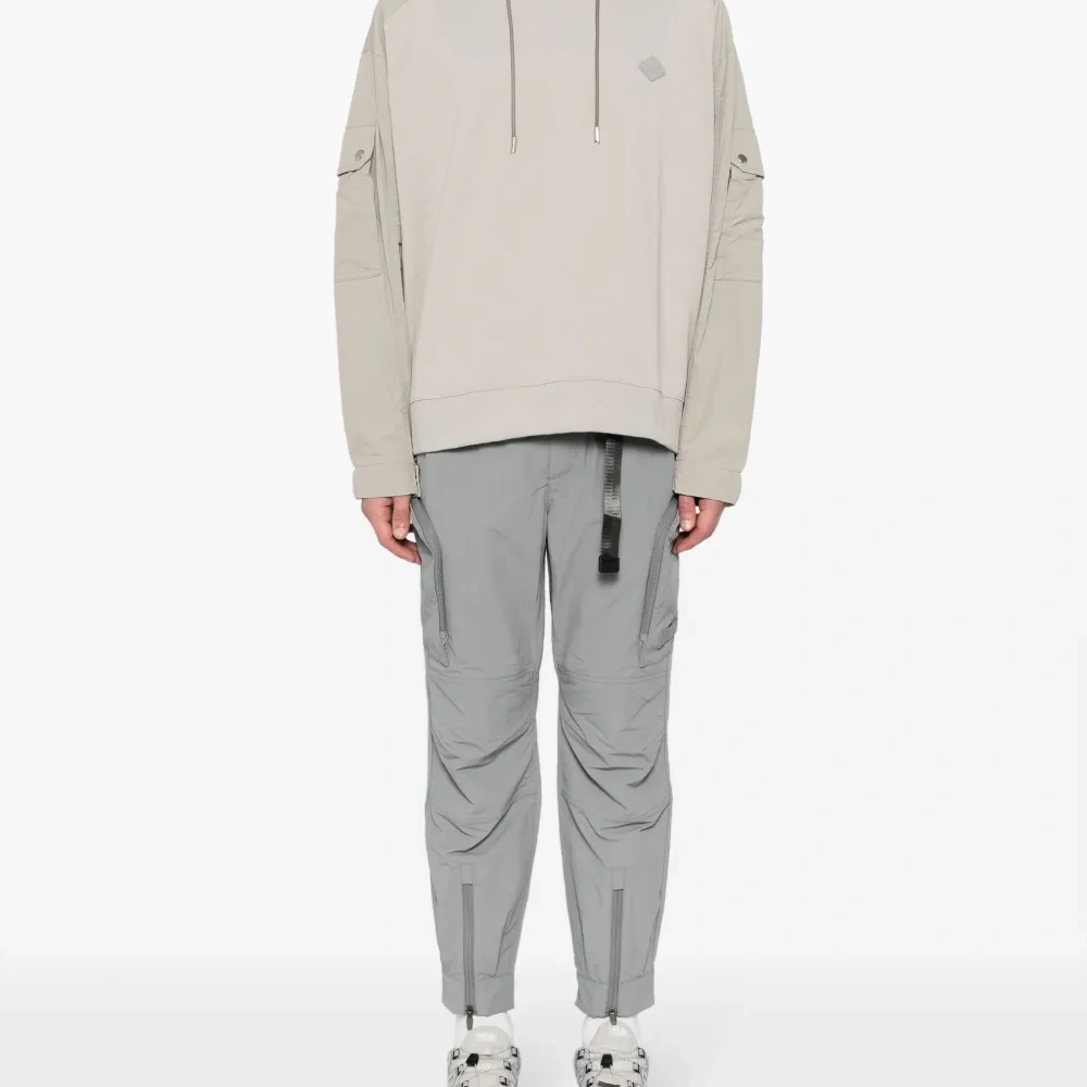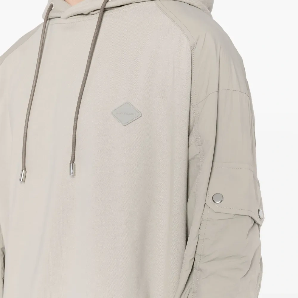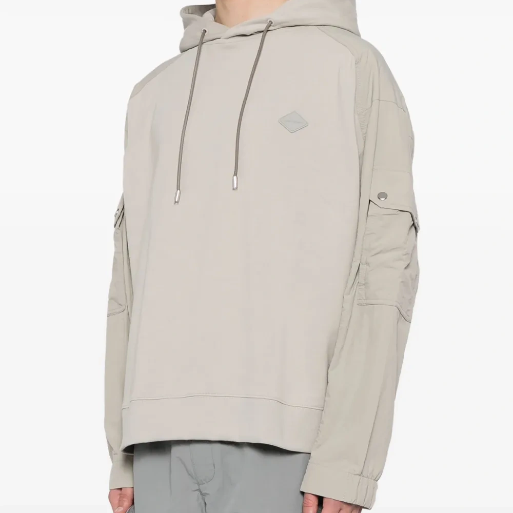 Серый бетон, экрю, хлопок, вставки, однотонная расцветка, логотип-аппликация, затягивающийся на шнурок капюшон, длинные рукава реглан, карман с клапаном на рукаве и прямой подол.