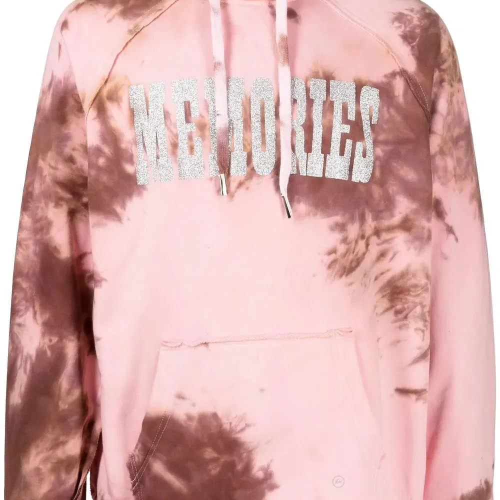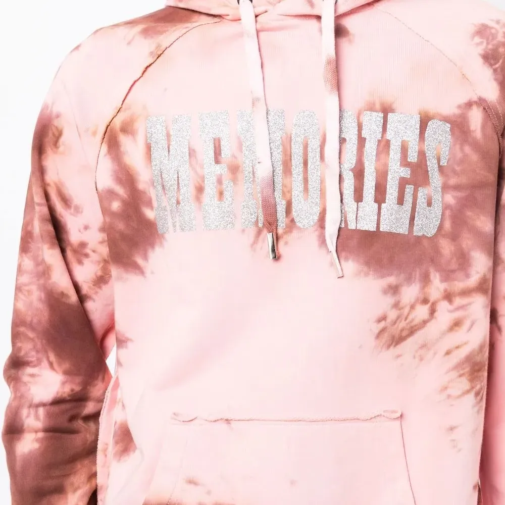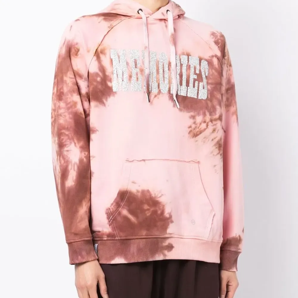 Бледно-розовый, винно-красный, хлопок, принт тай-дай, принт с надписью спереди, блестящий материал, затягивающийся на шнурок капюшон, длинные рукава реглан, карман-муфта, манжеты в рубчик и подол в рубчик.