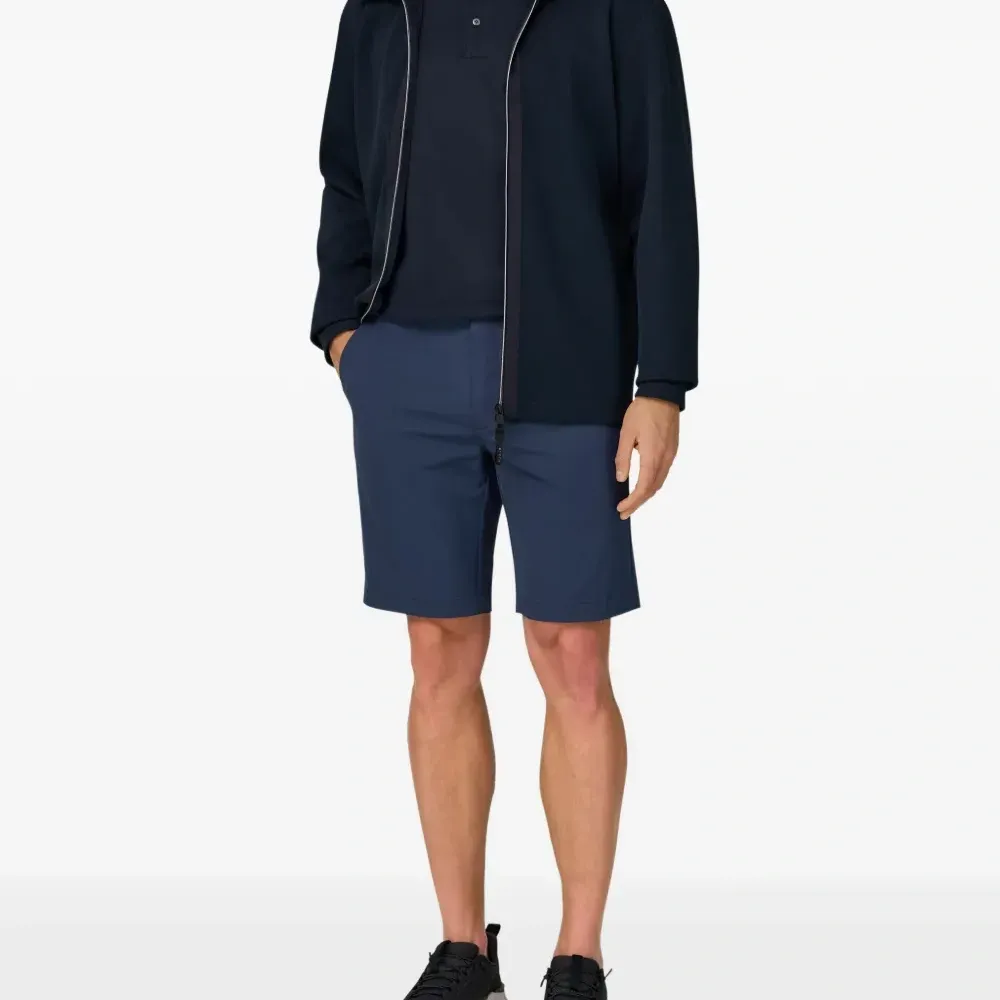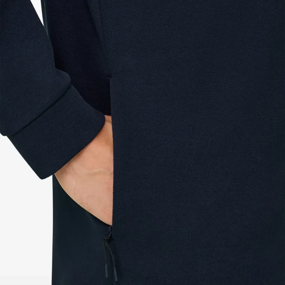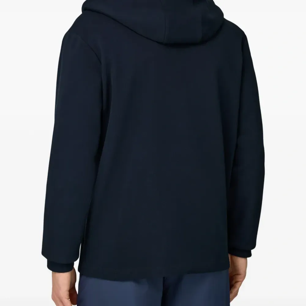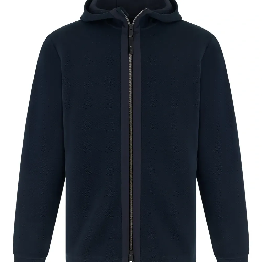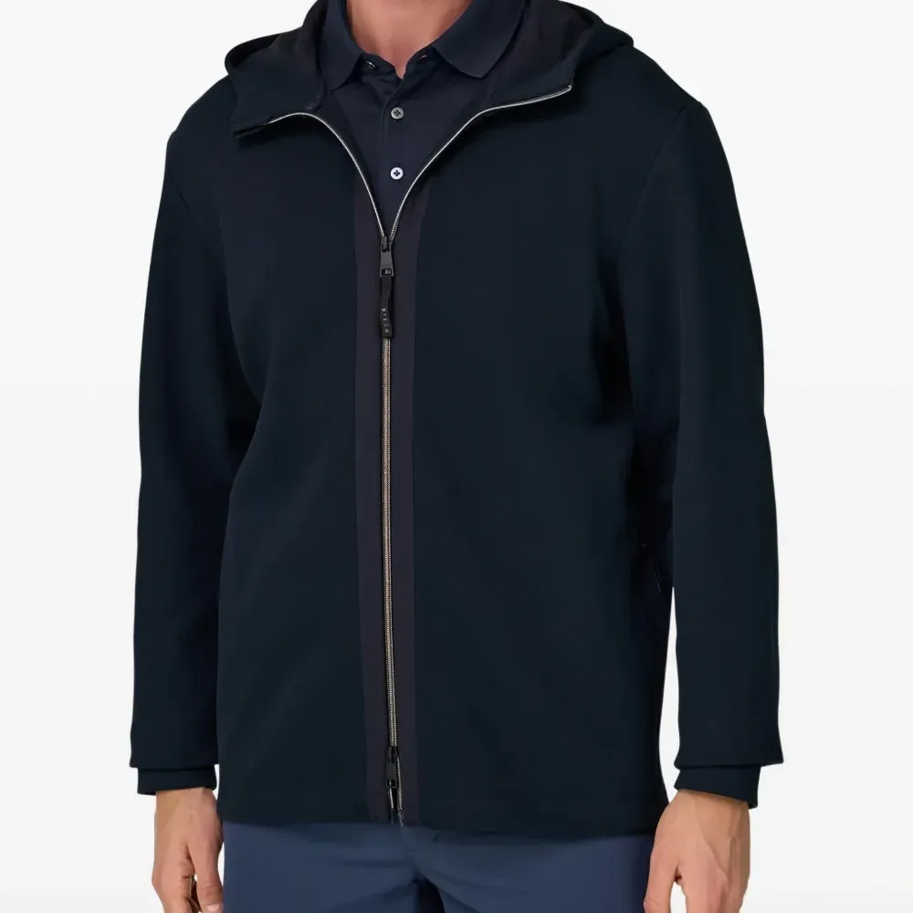 тёмно-синий пике, боковые карманы на молнии, застёжка-молния по всей длине, капюшон, контрастные тканевые вставки